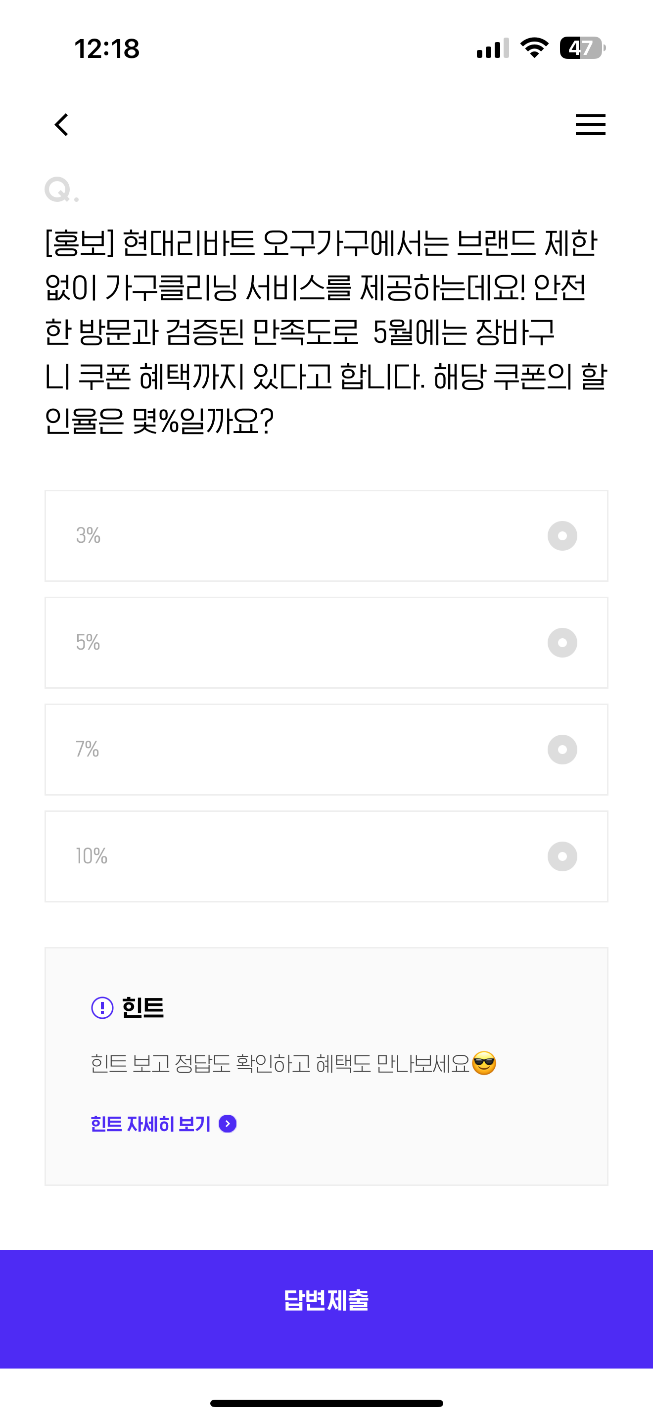 현대리바트 오구가구에서는 브랜드 제한없이 가구클리닝 서비스를 제공하는데요! 안전한 방문과 검증된 만족도로 5월에는 장바구니 쿠폰 혜택까지 있다고 합니다. 해당 쿠폰의 할인율은 몇%일까요? 보기는 1. 3% 2. 5% 3. 7% 4. 10% 입니다