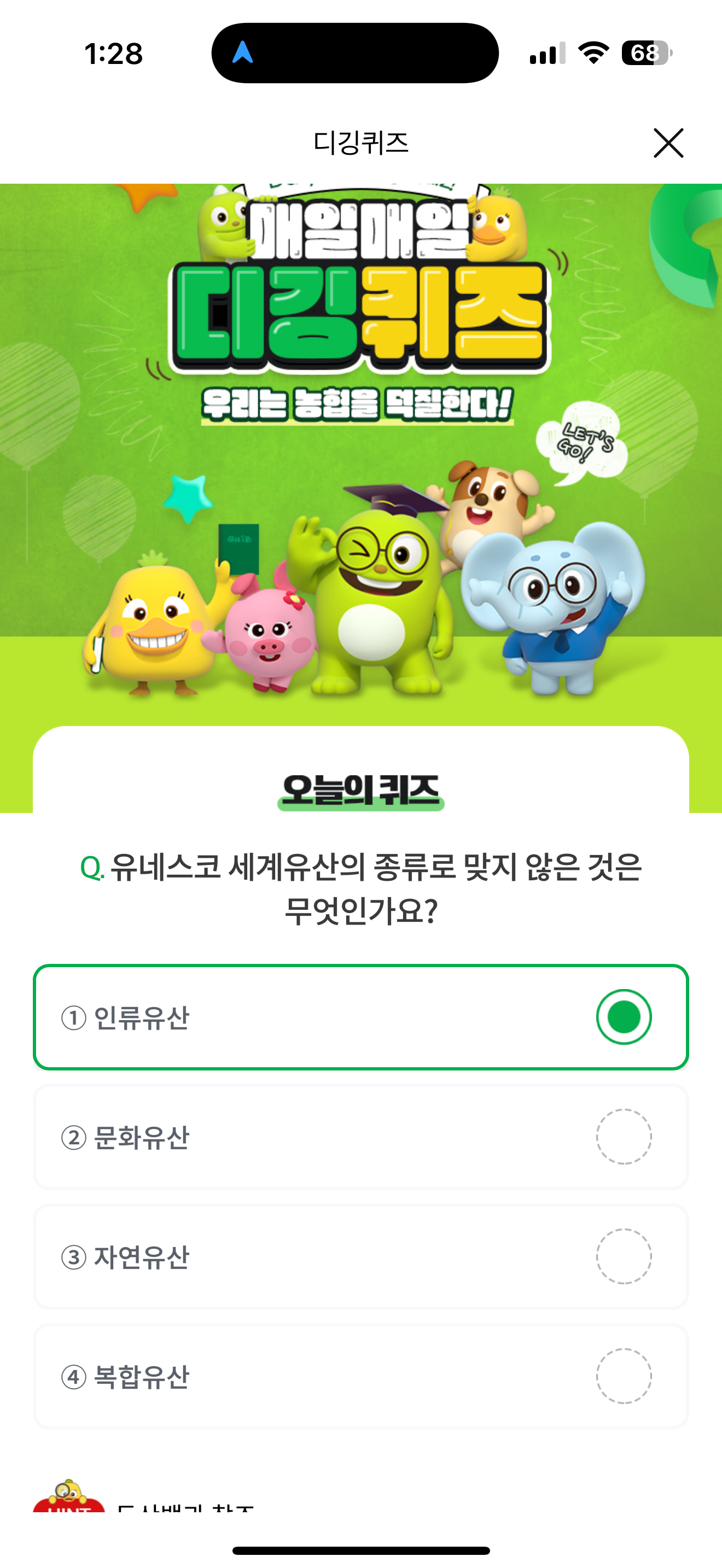 NH올원뱅크 디깅퀴즈 정답은 인류유산 입니다