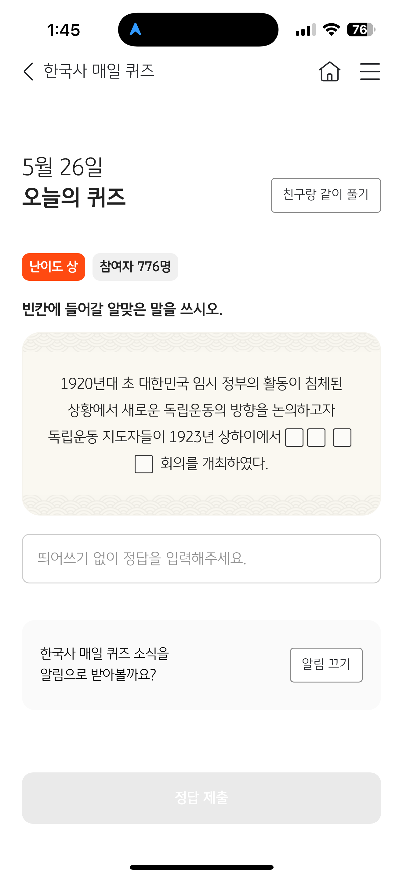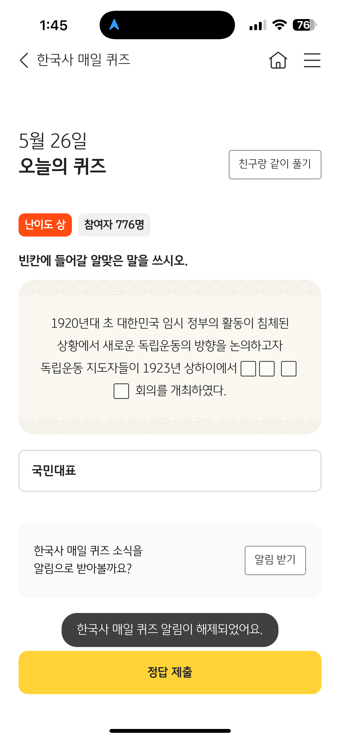 KB스타뱅킹 한국사 매일 퀴즈 정답은 국민대표 입니다