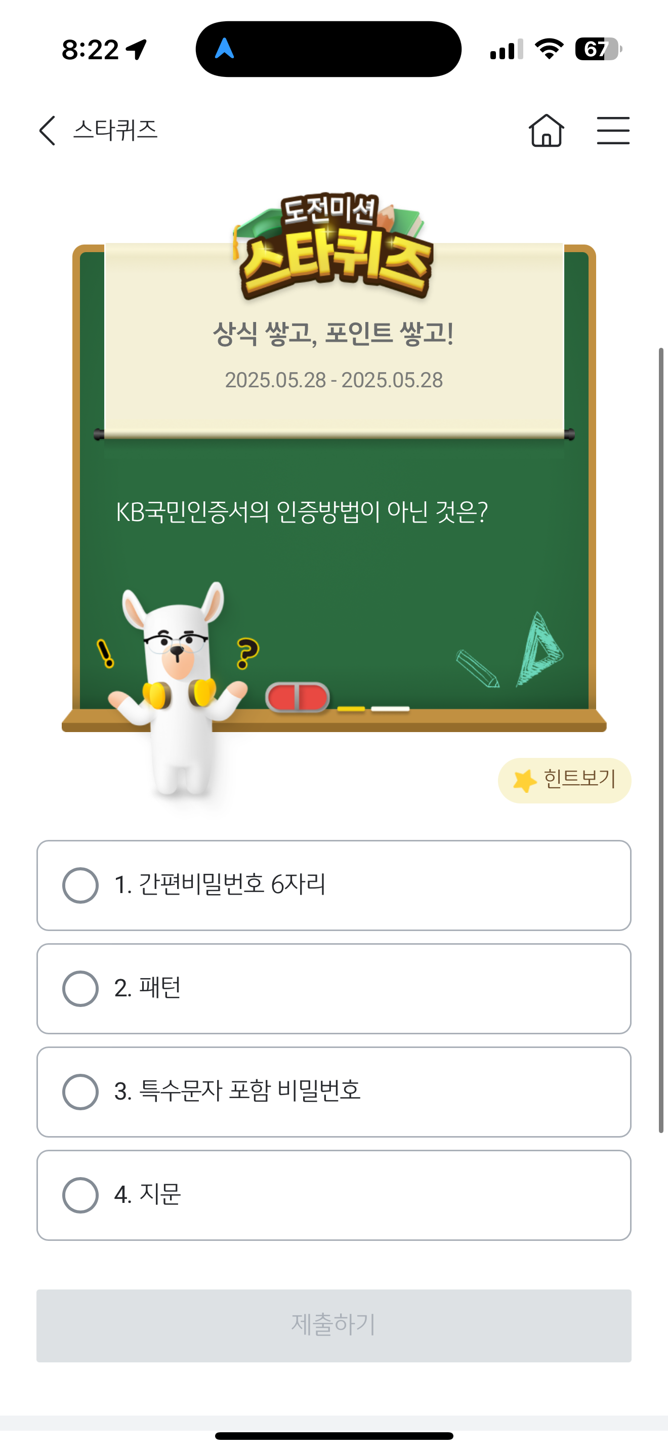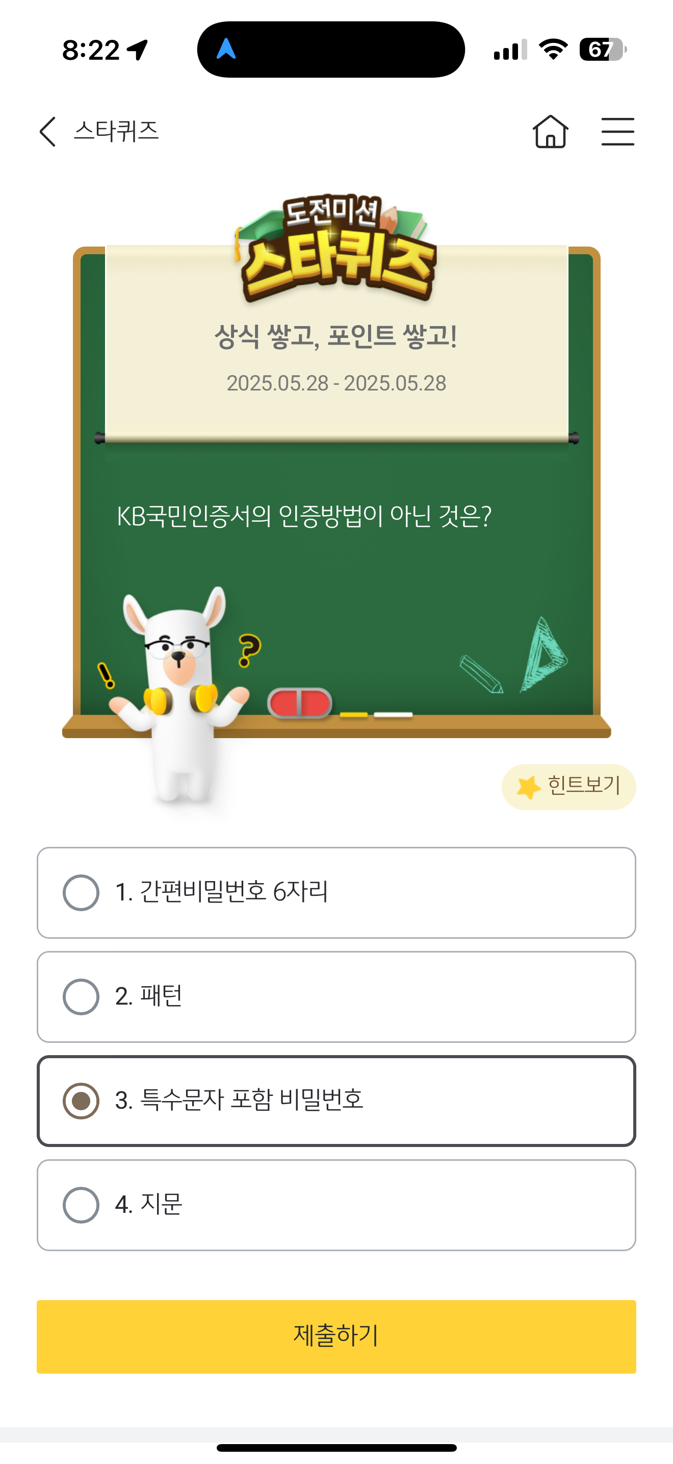 KB스타뱅킹 스타퀴즈 정답은 특수문자 포함 비밀번호 입니다