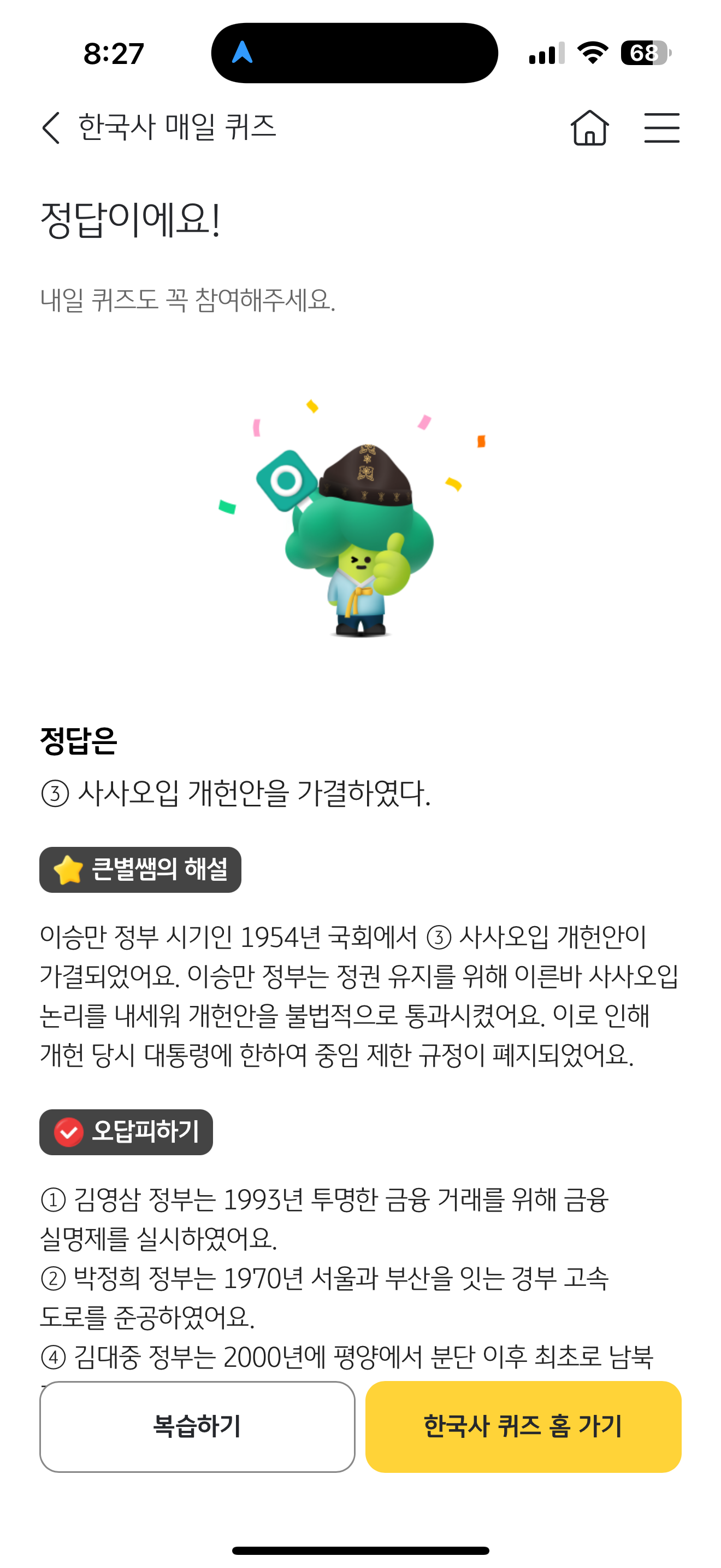 KB스타뱅킹 한국사 매일 퀴즈 정답은 사사오입 개헌안을 가결하였다 입니다