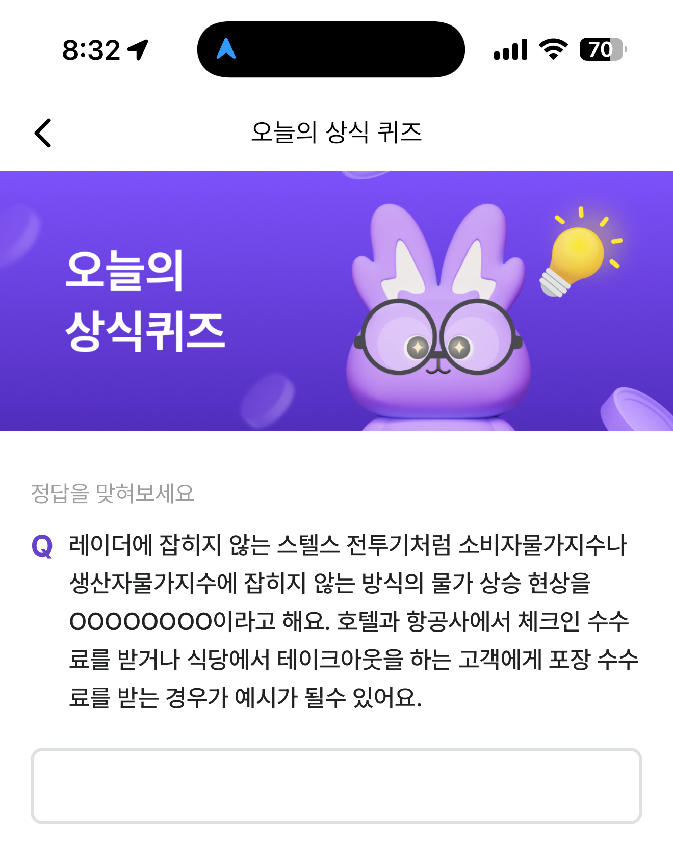 비트버니 오늘의 퀴즈 5월 28일 ㅅㅌㅅㅇㅍㄹㅇㅅ정답(레이더에 잡히지 않는 스텔스 전투기처럼 소비자물가지수나 생산자물가지수에 잡히지 않는 방식의 물가 상승 현상을 OOOOOOOO이라고 해요)