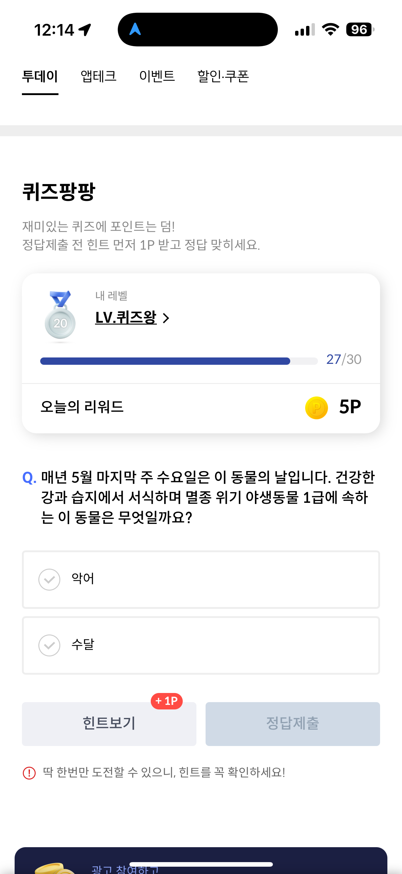신한카드 퀴즈팡팡 정답은 수달 입니다