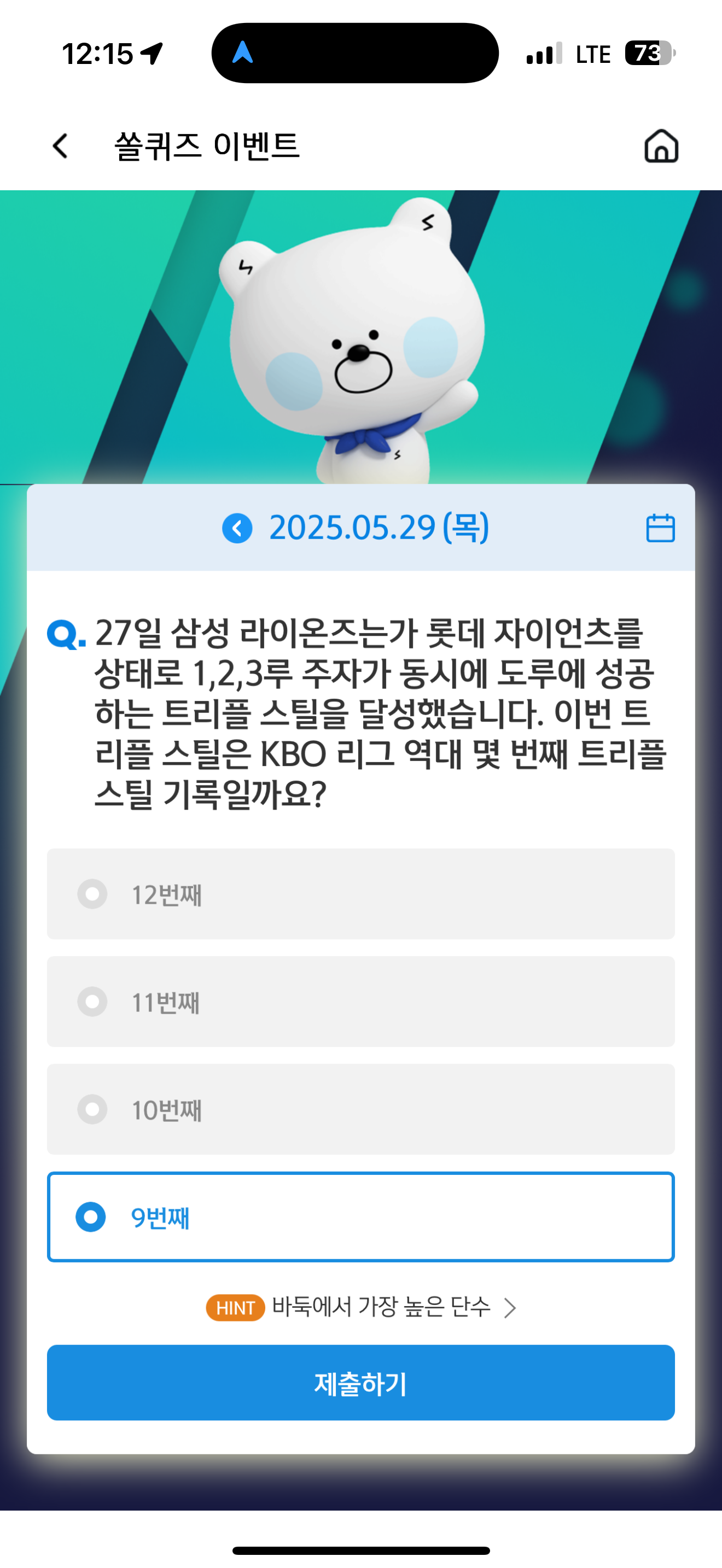신한 슈퍼SOL 야구/상식 쏠퀴즈 정답은 9번째 입니다