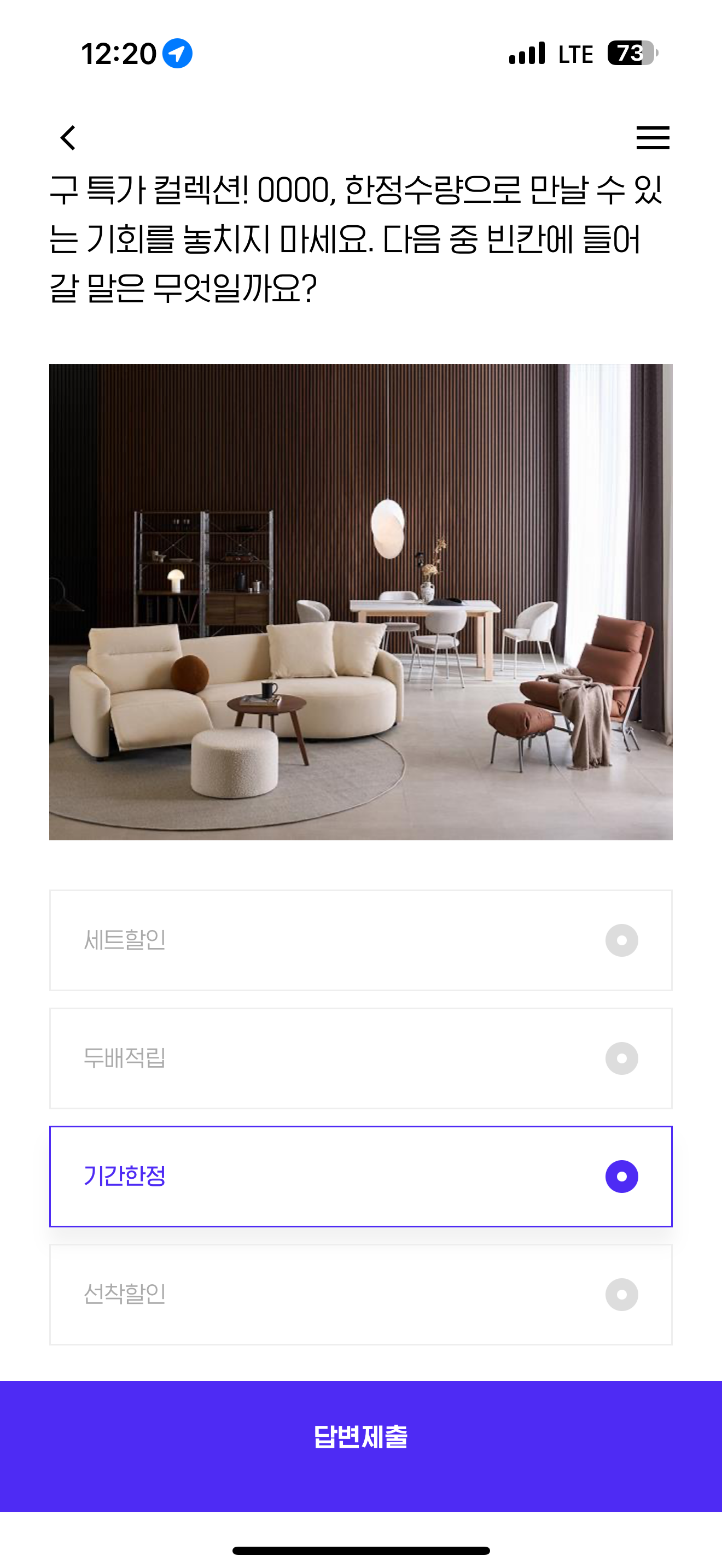 최대 70% 할인! 리바트가 엄선한 세계가구 특가 컬렉션! 0000, 한정수량으로 만날 수 있는 기회를 놓치지 마세요. 다음 중 빈칸에 들어갈 말은 무엇일까요? 보기는 1. 세트할인 2. 두배적립 3. 기간한정 4. 선착할인 입니다. 세계가구 특가 컬렉션입니다. 참고해 보세요