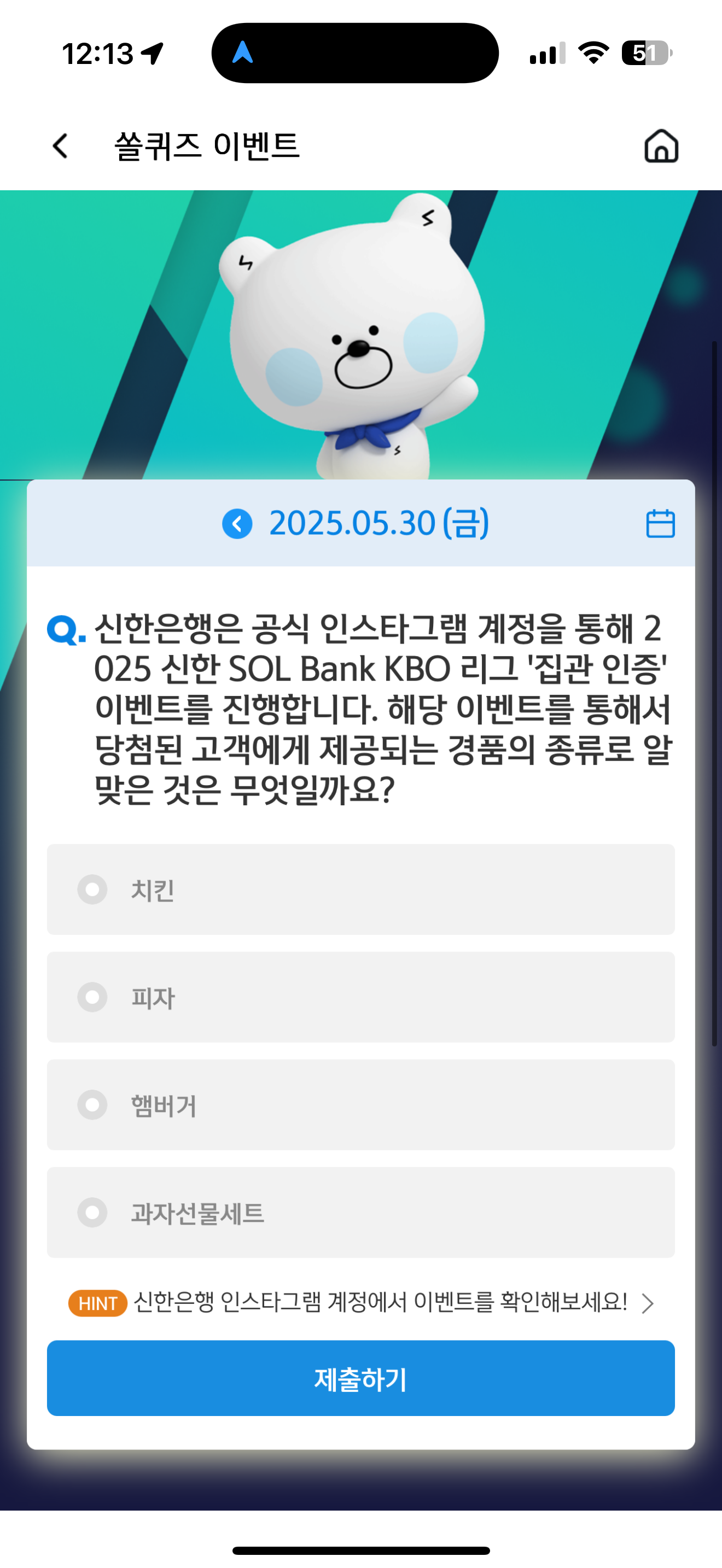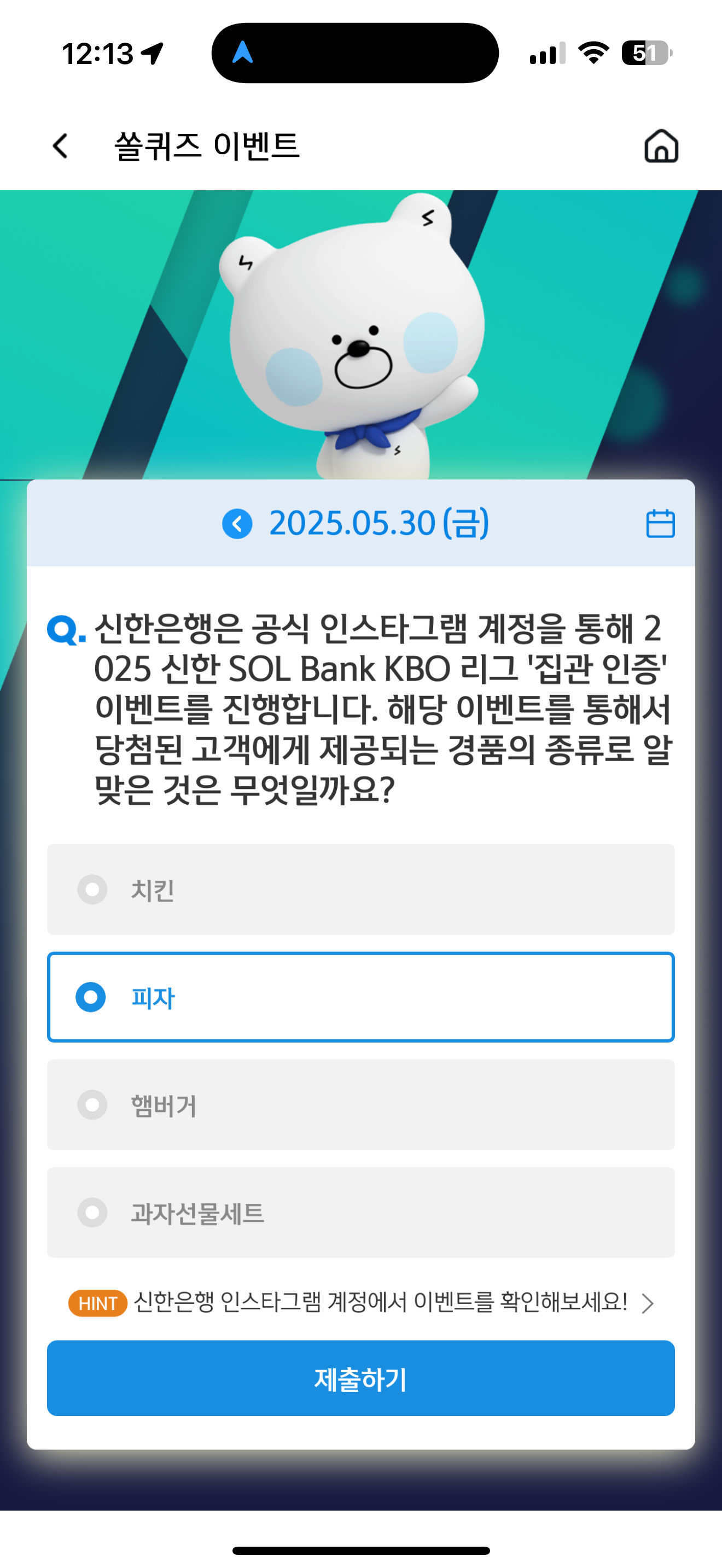 신한 슈퍼SOL 야구/상식 쏠퀴즈 정답은 피자 입니다
