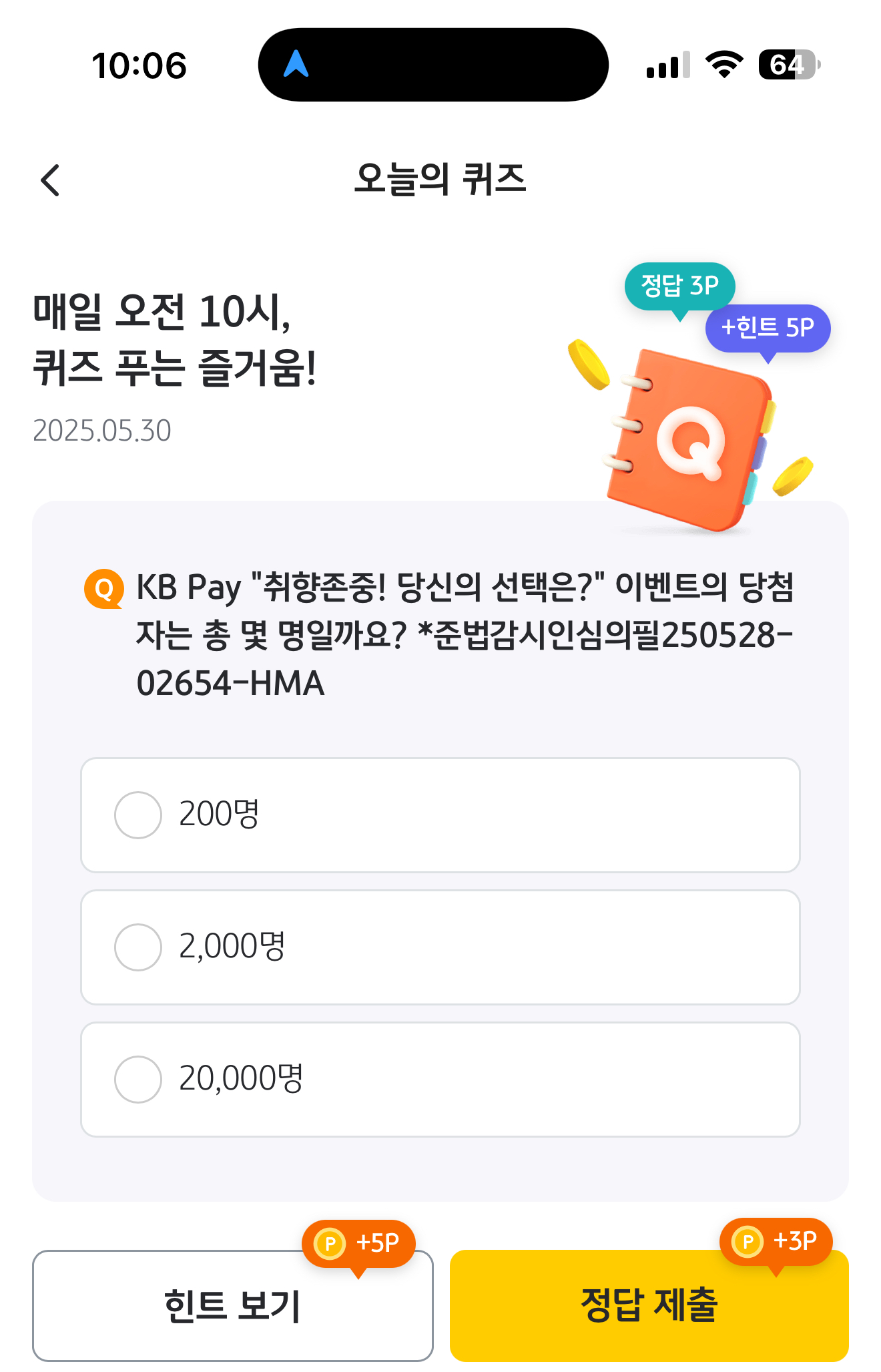 KB Pay "취향존중! 당신의 선택은?" 이벤트의 당첨자는 총 몇 명일까요? *준법감시인심의필250528-02654-HMA 보기는 1. 200명 2. 2,000명 3. 20,000명 입니다. 이벤트에 푸짐하게 뿌리고 있습니다. 잘 참고해서 도전해 보세요