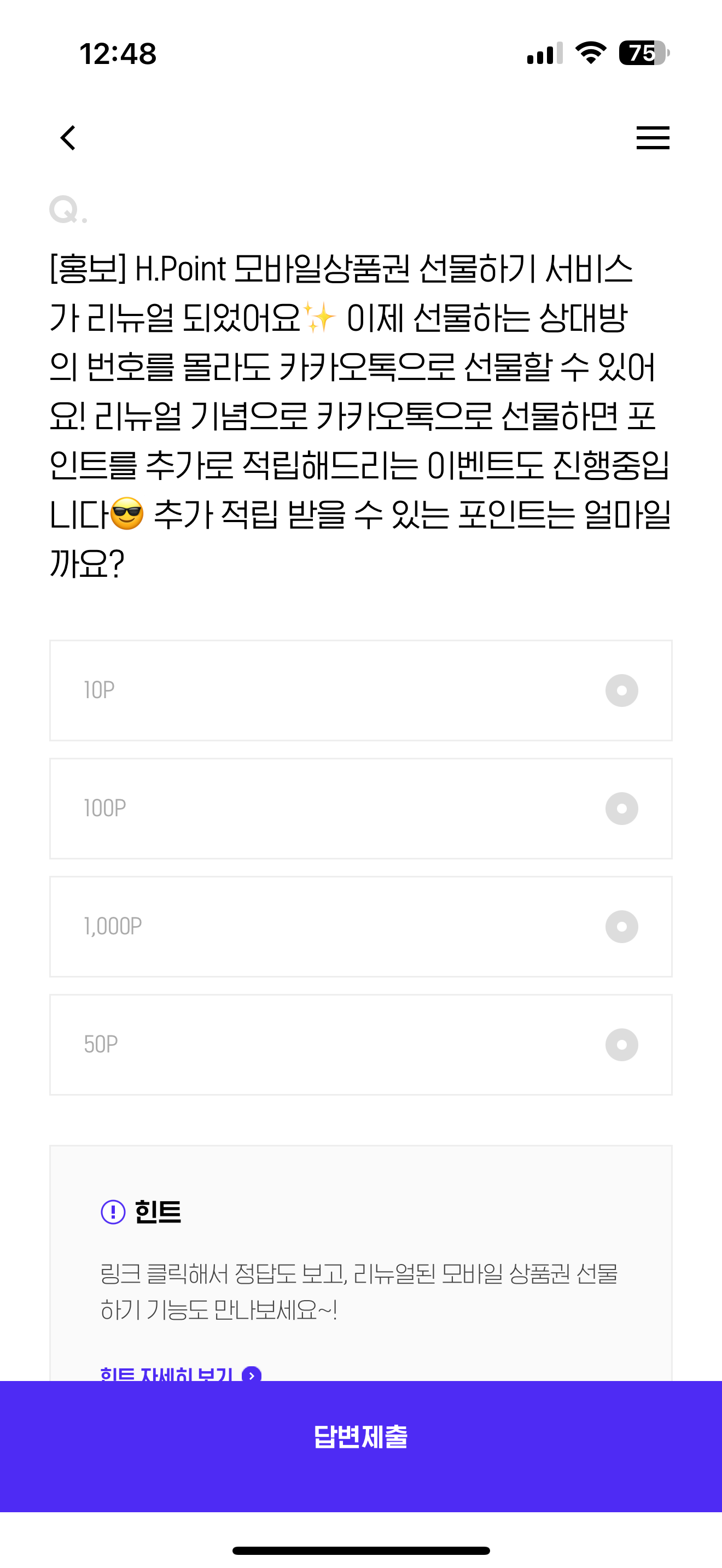 H.Point 모바일상품권 선물하기 서비스가 리뉴얼 되었어요 이제 선물하는 상대방의 번호를 몰라도 카카오톡으로 선물할 수 있어요! 리뉴얼 기념으로 카카오톡으로 선물하면 포인트를 추가로 적립해드리는 이벤트도 진행중입니다 추가 적립 받을 수 있는 포인트는 얼마일까요? 보기는 1. 10P 2. 100P 3. 1,000P 4. 50P 입니다