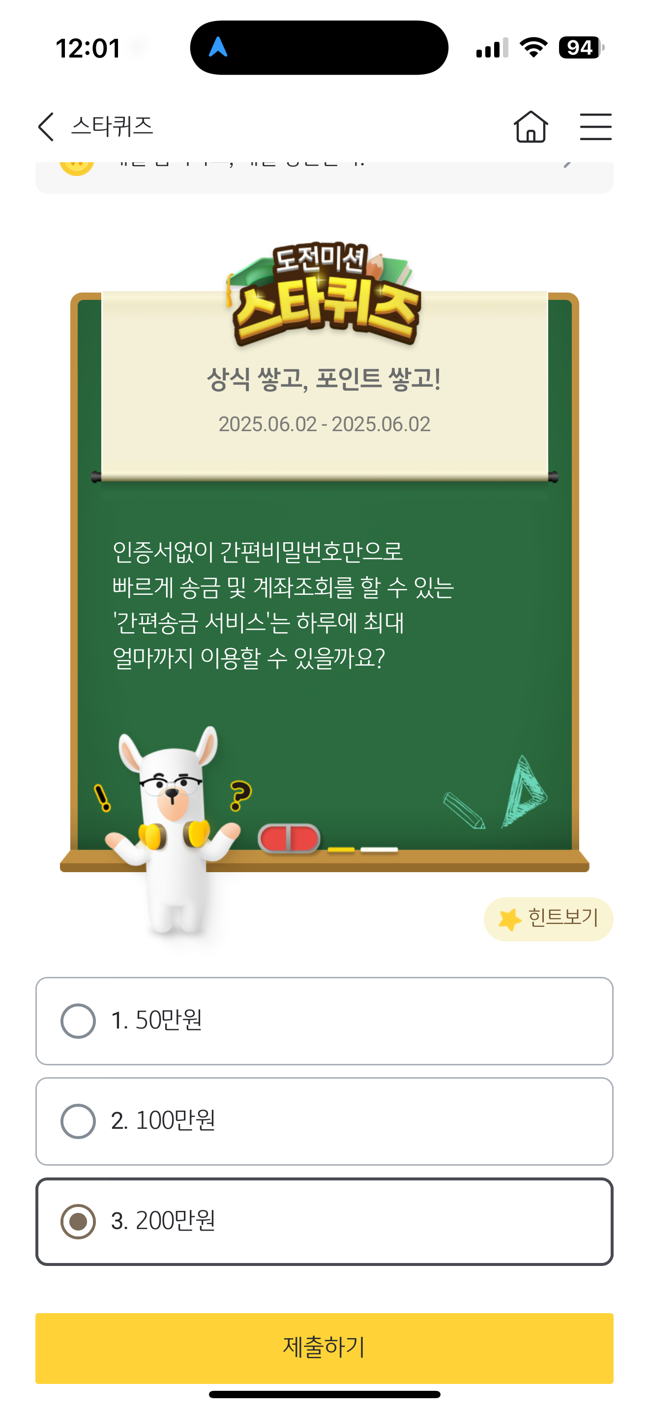 인증서없이 간편비밀번호만으로 빠르게 송금 및 계좌조회를 할 수 있는 '간편송금 서비스'는 하루에 최대 얼마까지 이용할 수 있을까요? 보기는 1. 50만원 2. 100만원 3. 200만원 입니다. 간편비밀번호만으로 송금이 가능하다는 사실 아시나요? 잘 참고해서 활용해 보세요