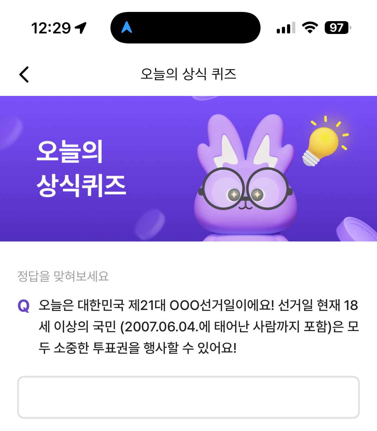오늘은 대한민국 제21대 OOO선거일이에요! 선거일 현재 18세 이상의 국민 (2007.06.04.에 태어난 사람까지 포함)은 모두 소중한 투표권을 행사할 수 있어요! 주관식 퀴즈인데요. 투표권을 가진 사람들은 소중한 한표를 잘 행사하시기 바랍니다.