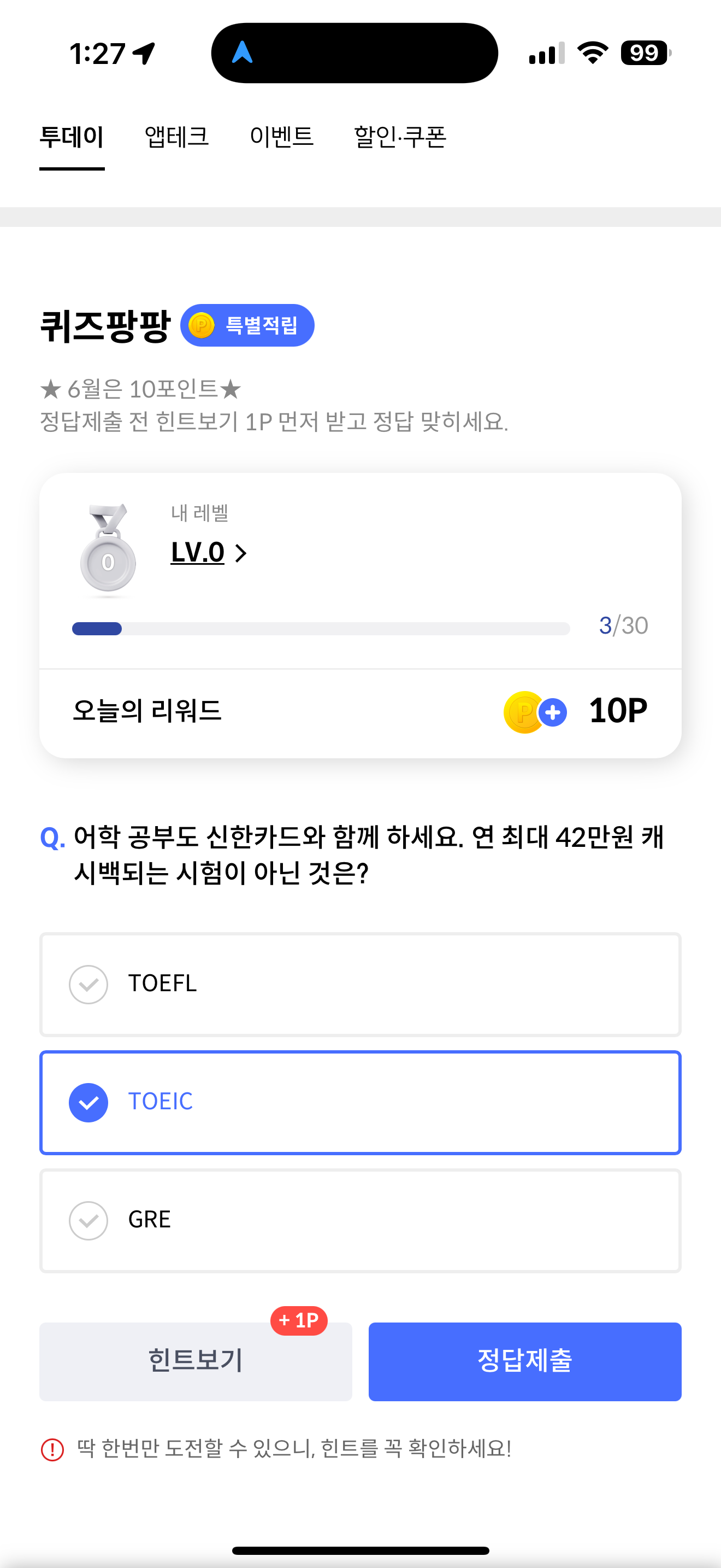 신한카드 퀴즈팡팡 정답은 TOEIC 입니다