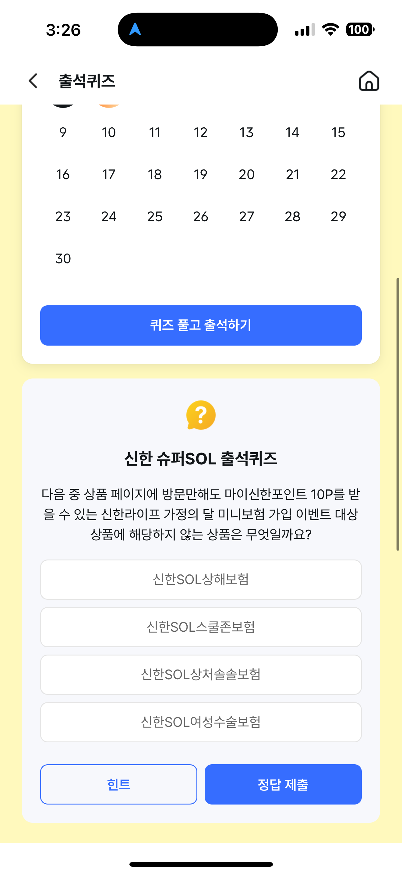 신한 슈퍼SOL 출석퀴즈 정답은 신한SOL 여성수술보험 입니다