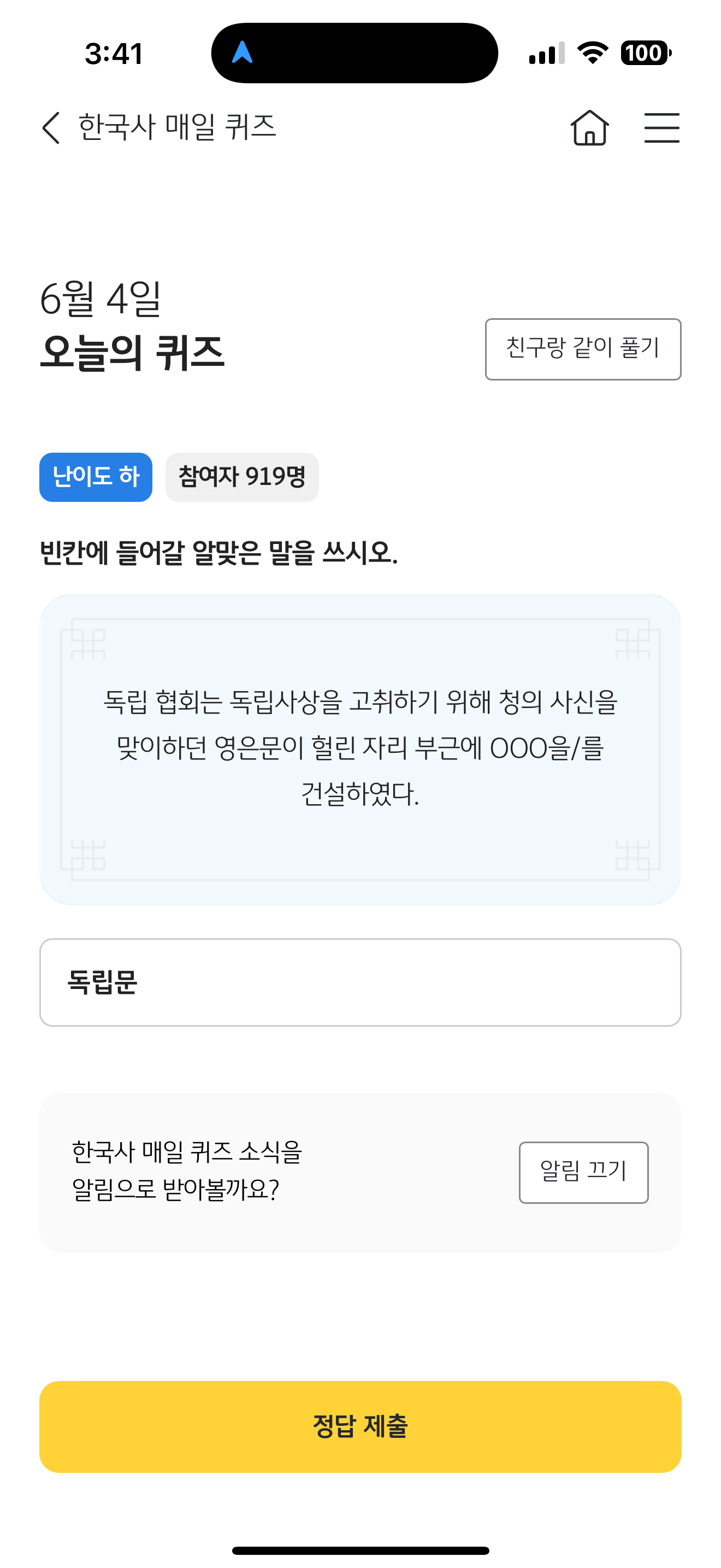 KB스타뱅킹 한국사 매일 퀴즈 6월 4일 정답(독립 협회는 독립사상을 고취하기 위해 청의 사신을 맞이하던 영은문이 헐린 자리 부근에 OOO을/를 건설하였다)