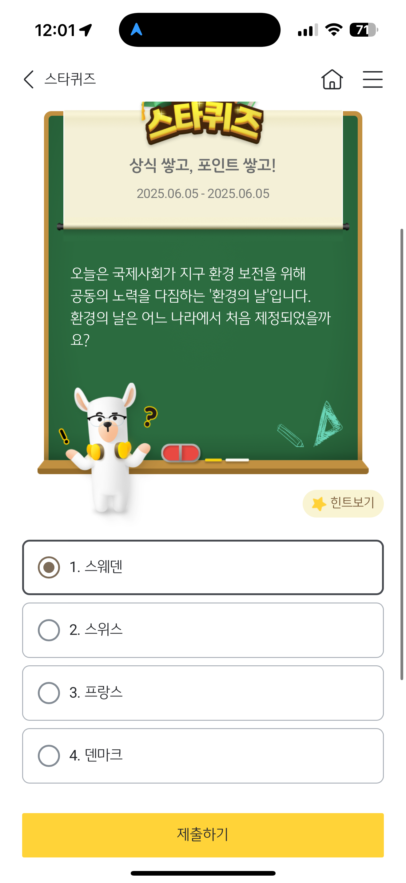KB스타뱅킹 스타퀴즈 정답은 스웨덴 입니다