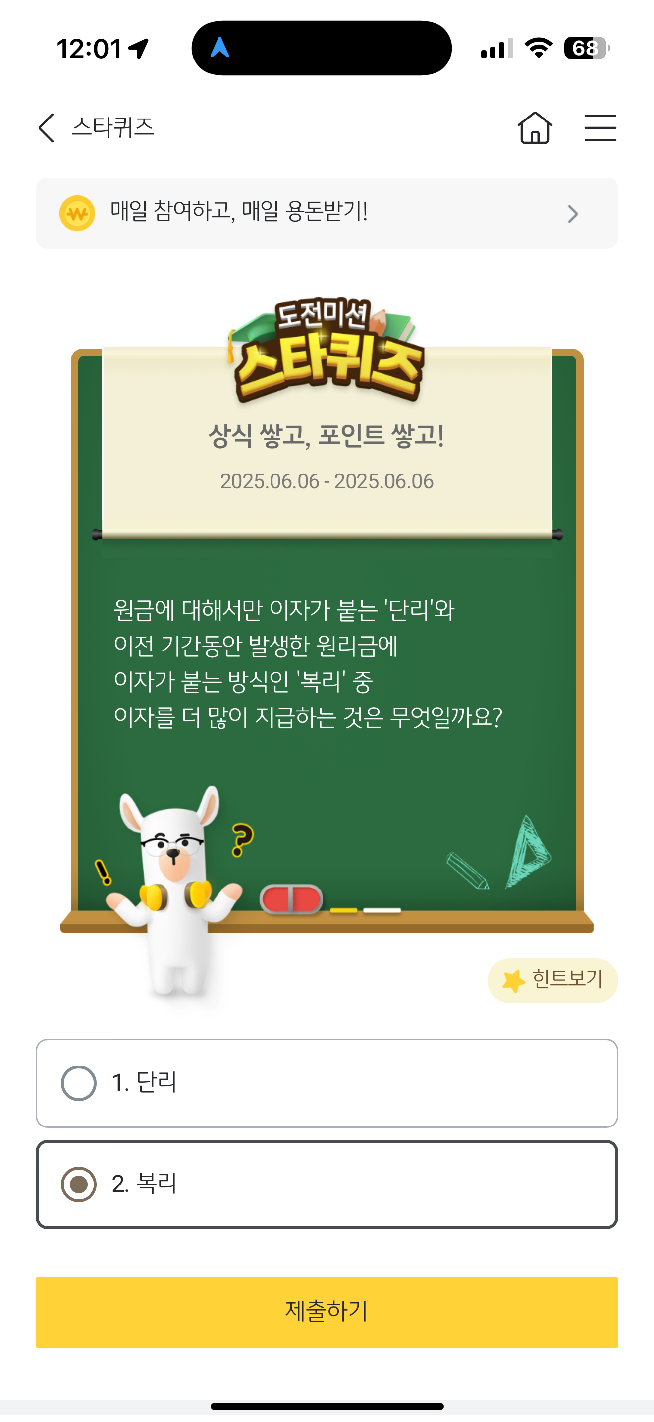 KB스타뱅킹 스타퀴즈 정답은 복리 입니다