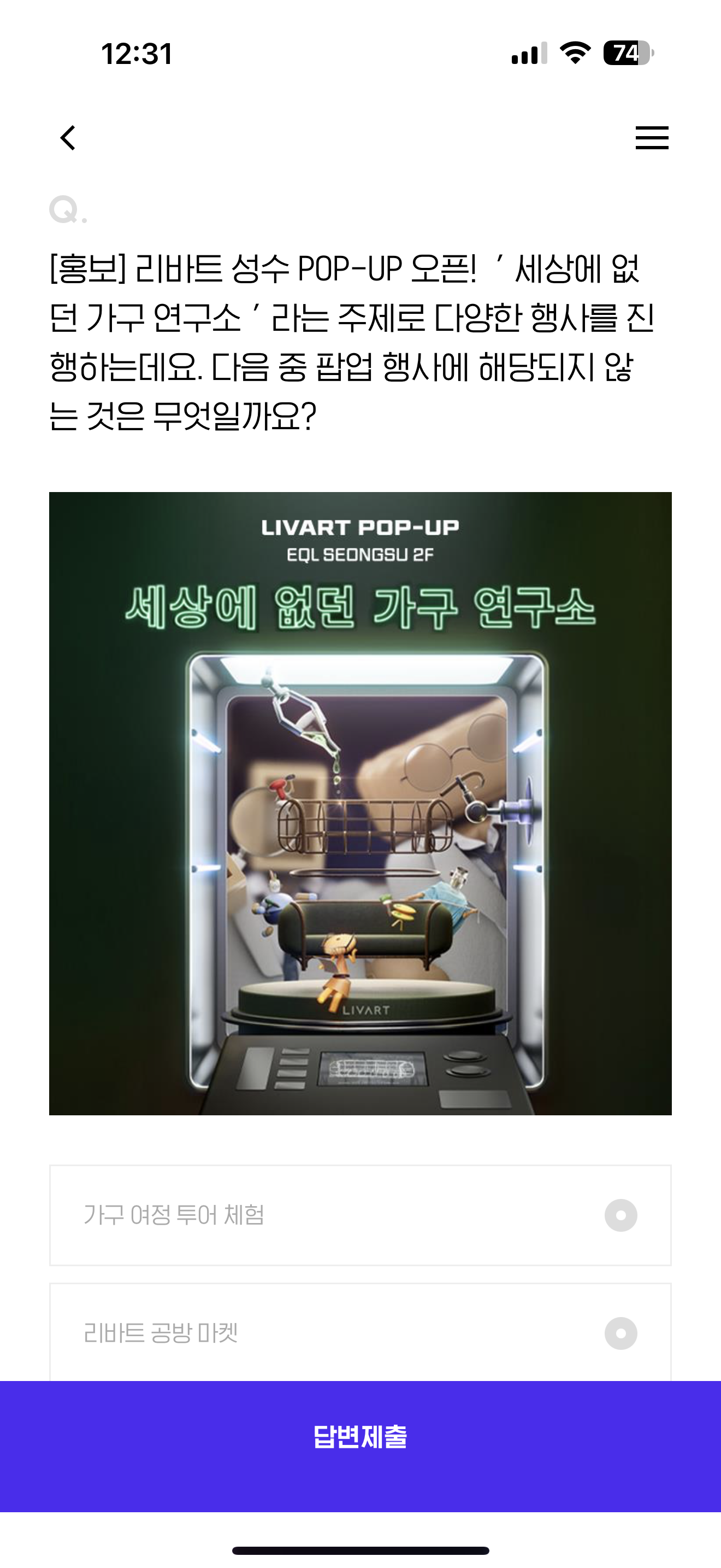 리바트 성수 POP-UP 오픈! ' 세상에 없던 가구 연구소 ' 라는 주제로 다양한 행사를 진행하는데요. 다음 중 팝업 행사에 해당되지 않는 것은 무엇일까요? 보기는 1. 가구 여정 투어 체험 2. 리바트 공방 마켓 3. 공방 원데이 클래스 4. 가구 리폼 체험 입니다