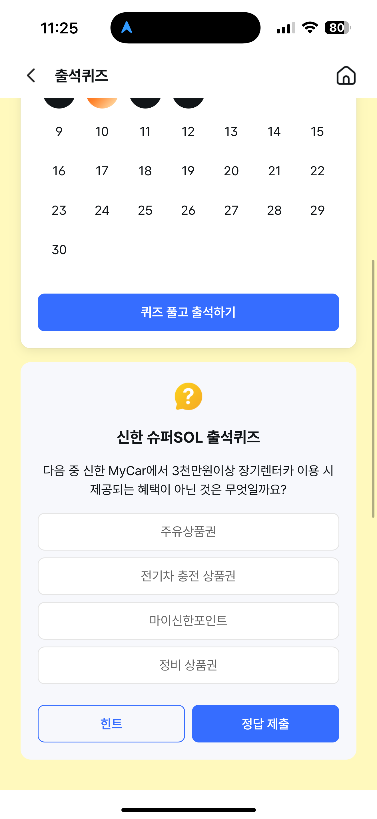 신한 슈퍼SOL 출석퀴즈 정답은 주유상품권 입니다