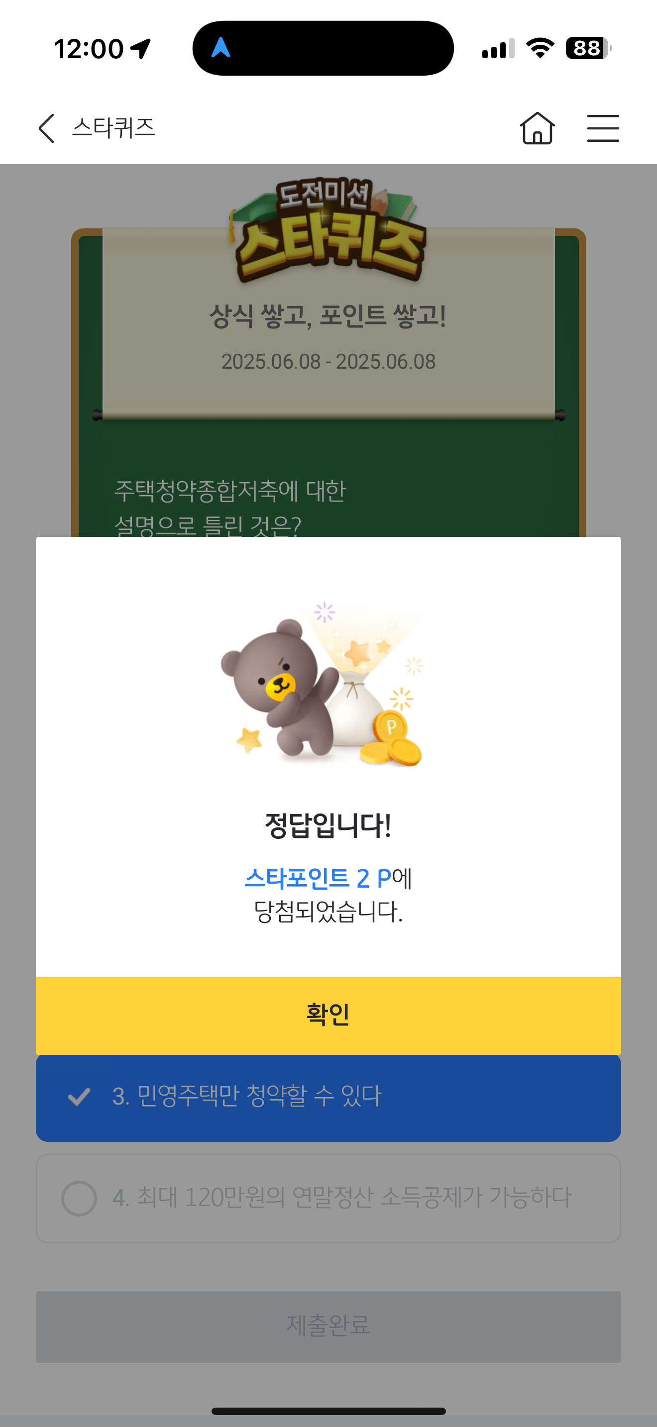 KB스타뱅킹 스타퀴즈 정답은 민영주택만 청약할 수 있다 입니다
