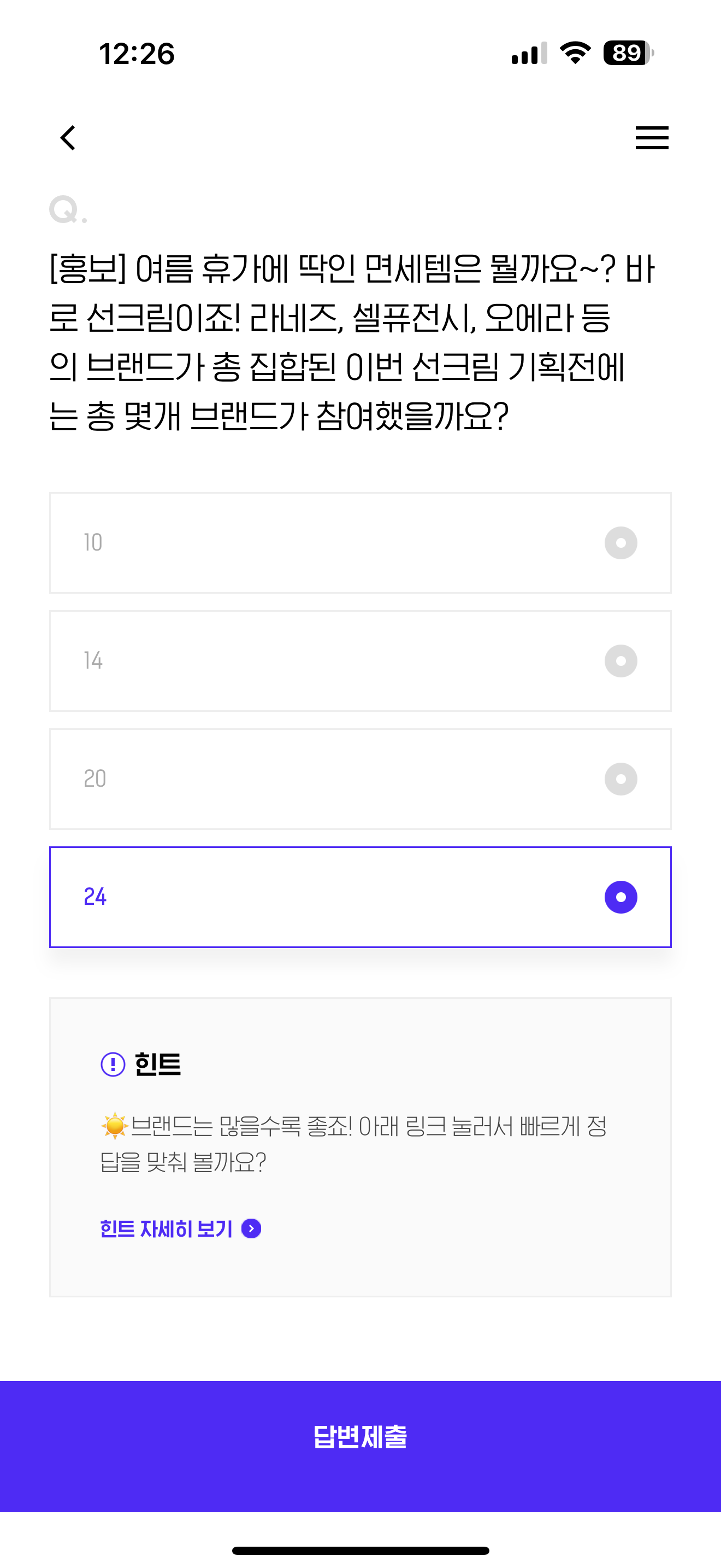 여름 휴가에 딱인 면세템은 뭘까요~? 바로 선크림이죠! 라네즈, 셀퓨전시, 오에라 등의 브랜드가 총 집합된 이번 선크림 기획전에는 총 몇개 브랜드가 참여했을까요? 보기는 1. 10 2. 14 3. 20 4. 24 입니다.