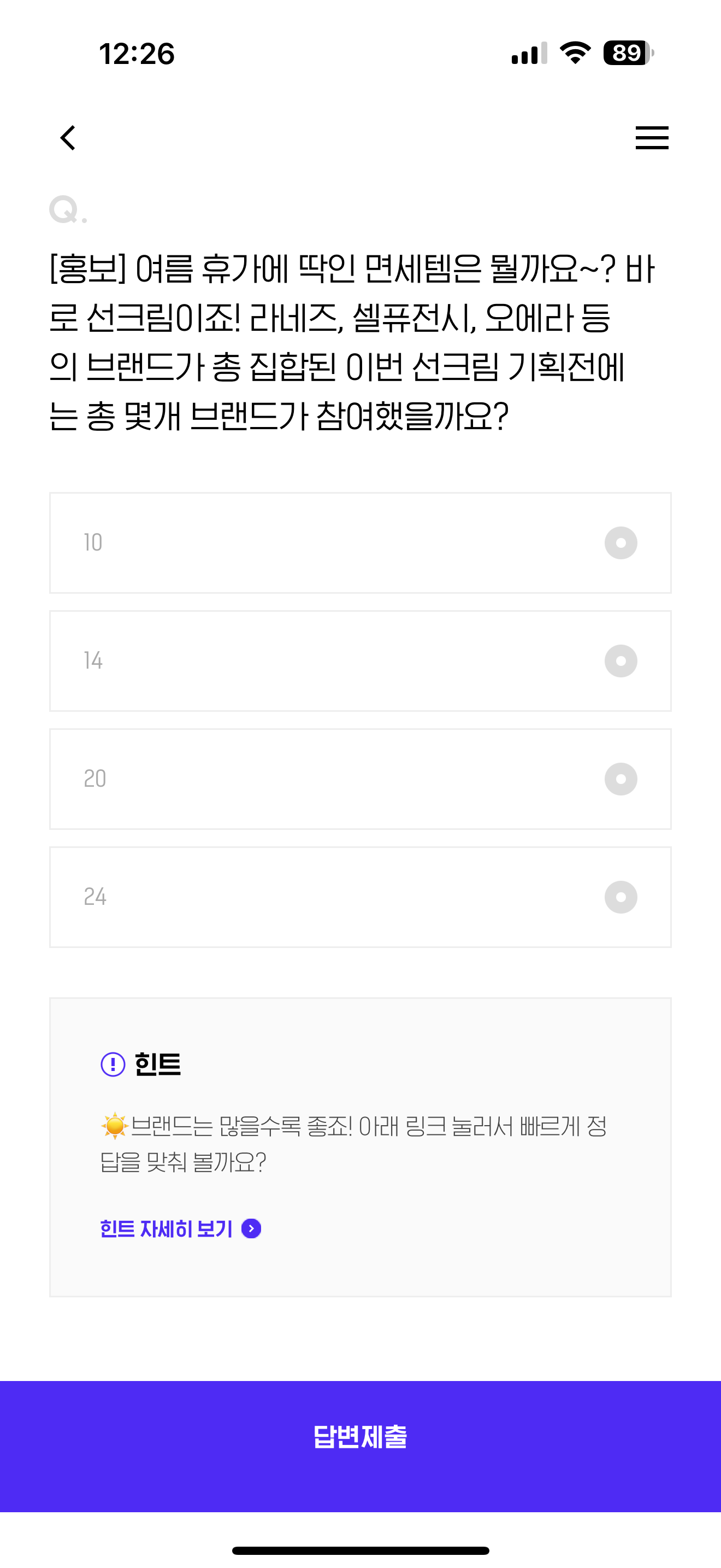 여름 휴가에 딱인 면세템은 뭘까요~? 바로 선크림이죠! 라네즈, 셀퓨전시, 오에라 등의 브랜드가 총 집합된 이번 선크림 기획전에는 총 몇개 브랜드가 참여했을까요? 보기는 1. 10 2. 14 3. 20 4. 24 입니다.