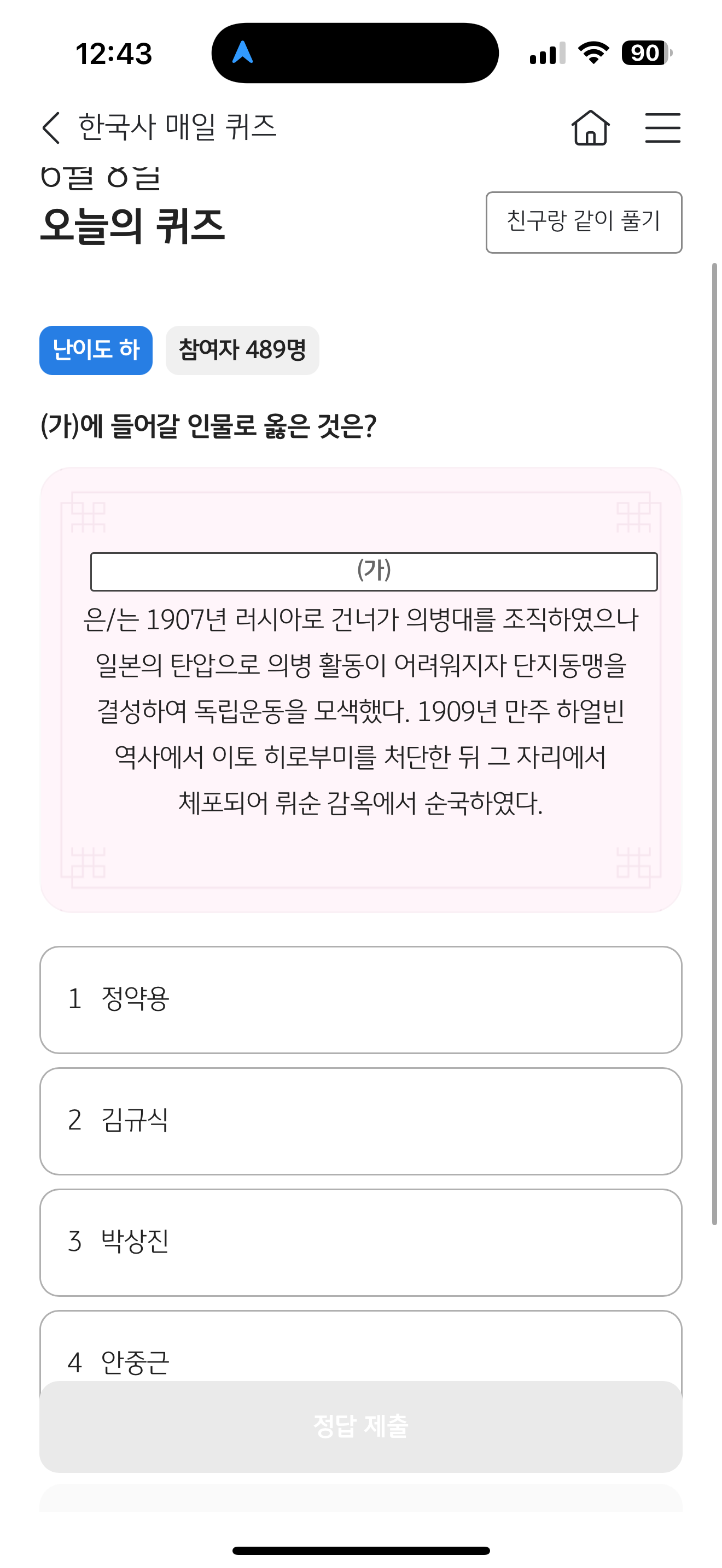 KB스타뱅킹 한국사 매일 퀴즈 정답은 안중근 입니다