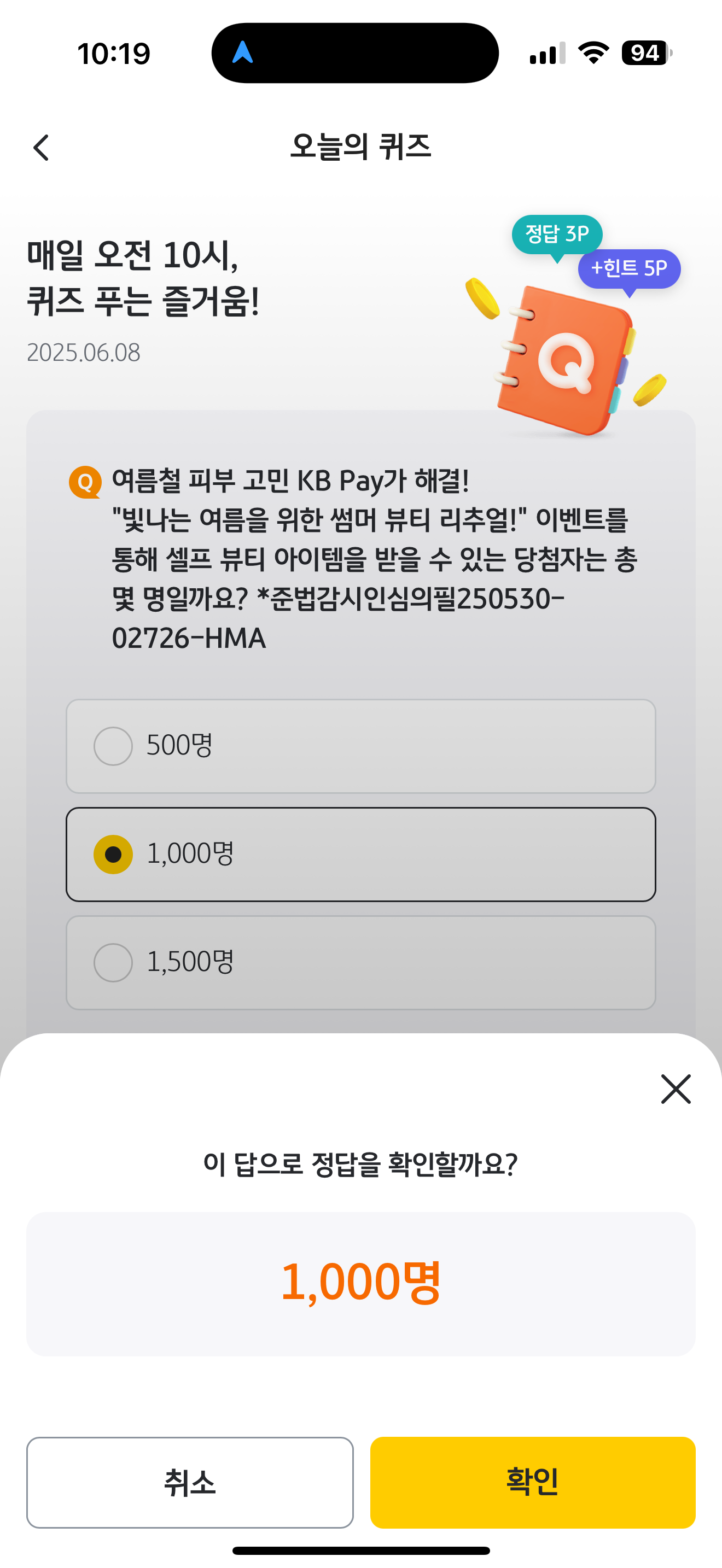KB pay 오늘의 퀴즈 정답은 1,000명 입니다