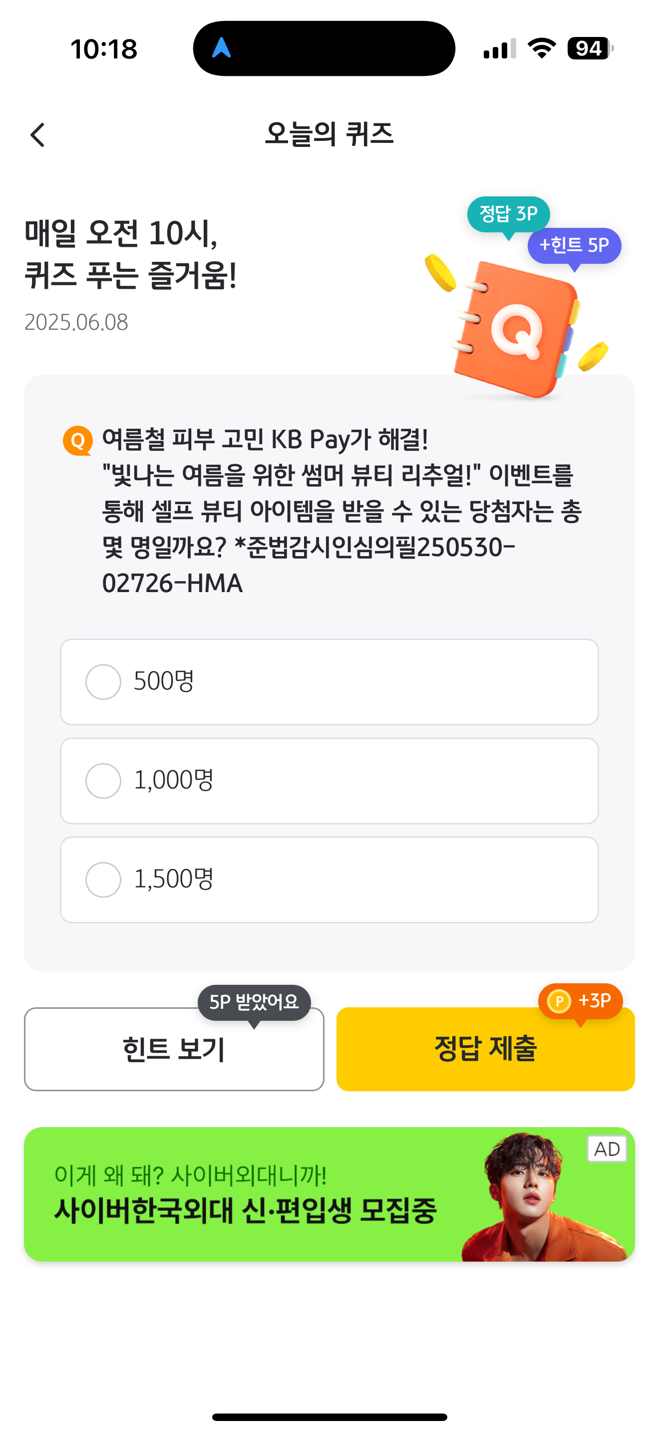 여름철 피부 고민 KB Pay가 해결! "빛나는 여름을 위한 썸머 뷰티 리추얼!" 이벤트를 통해 셀프 뷰티 아이템을 받을 수 있는 당첨자는 총 몇 명일까요? *준법감시인심의필250530-02726-HMA 보기는 1. 500명 2. 1,000명 3. 1,500명 입니다.