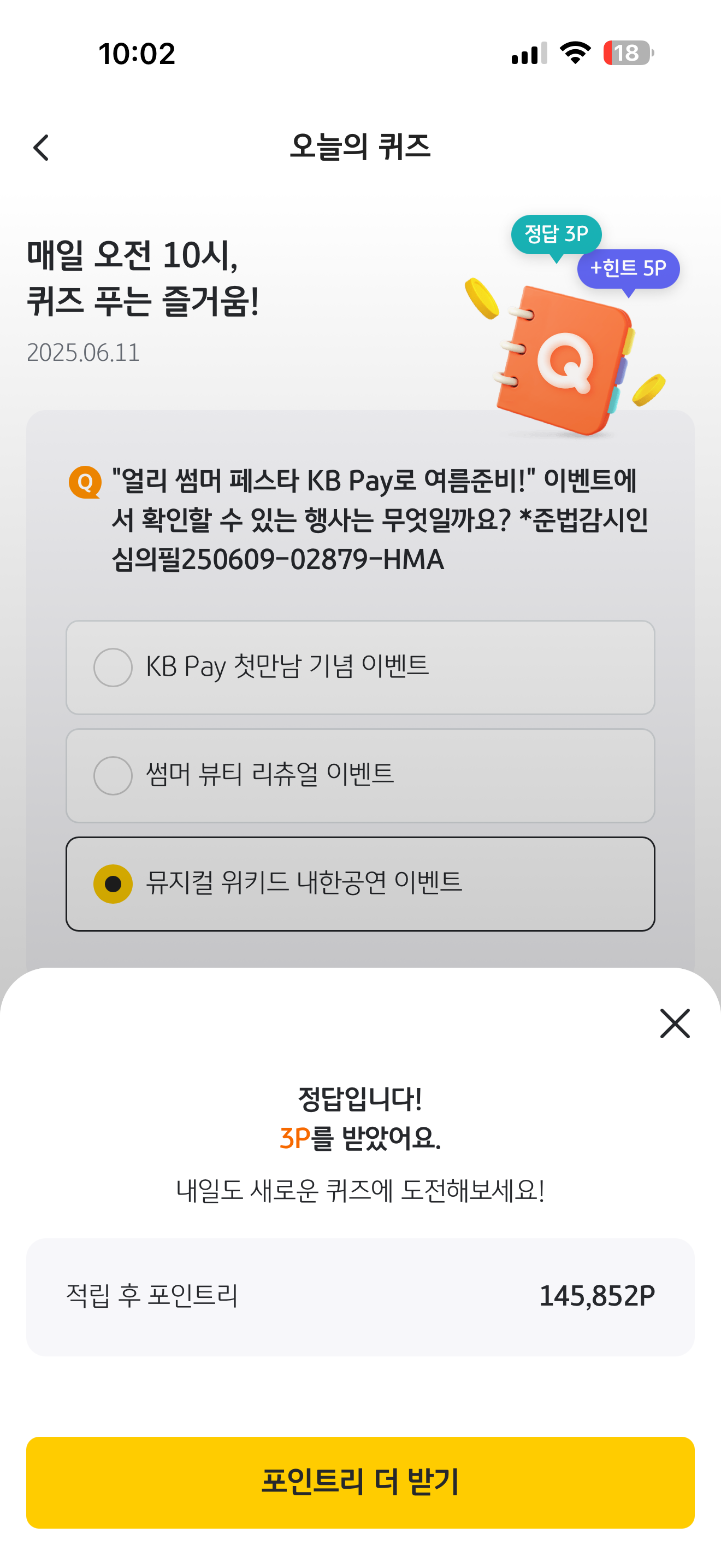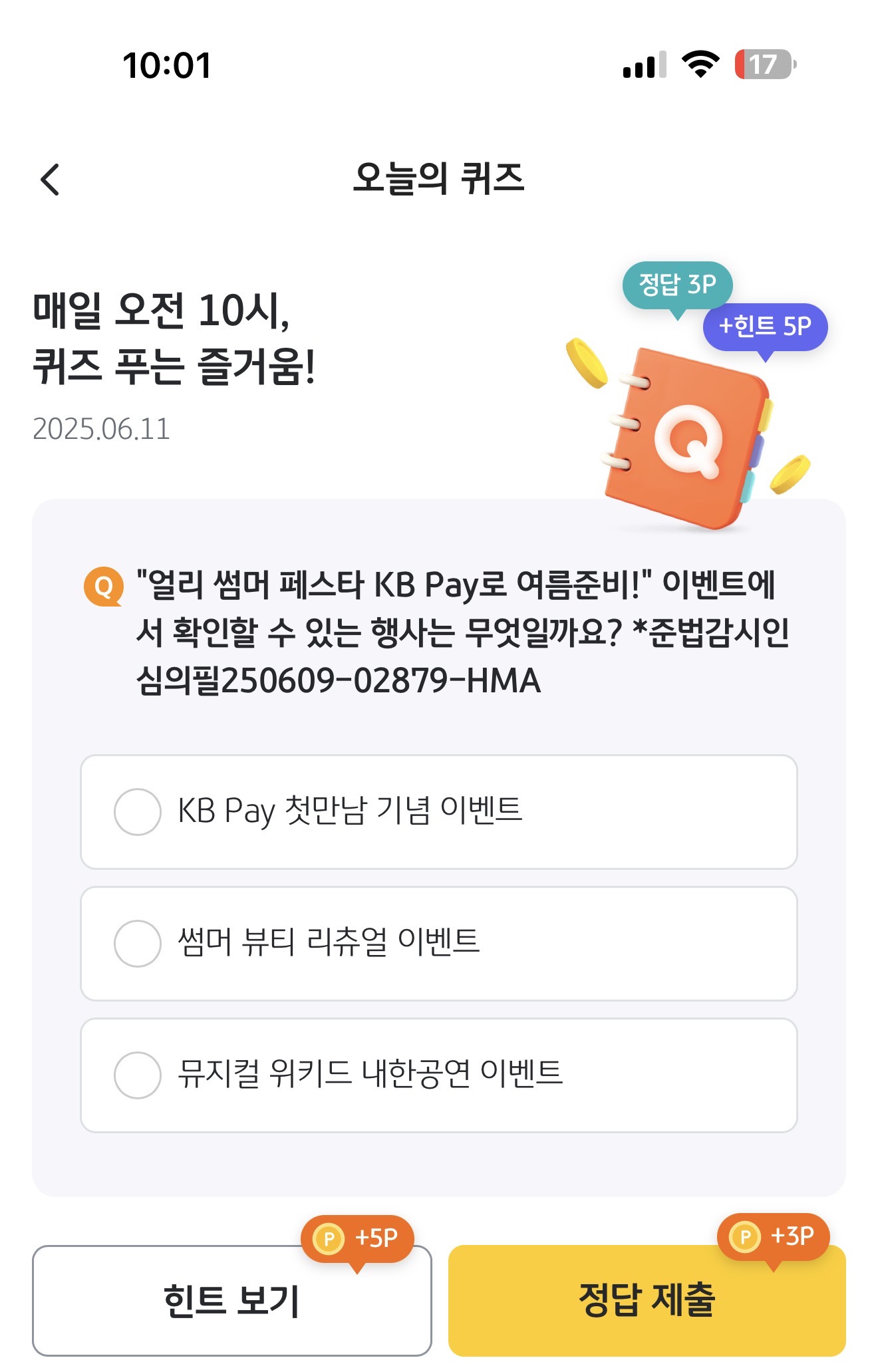 KB pay 오늘의 퀴즈 6월 11일 정답("얼리 썸머 페스타 KB Pay로 여름준비!" 이벤트에서 확인할 수 있는 행사는 무엇일까요?)
