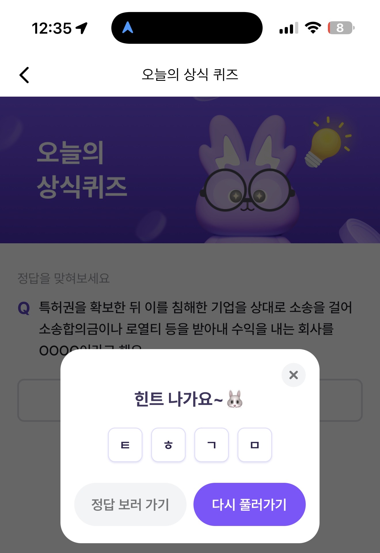 비트버니 오늘의 퀴즈 6월 12일 ㅌㅎㄱㅁ 정답(특허권을 확보한 뒤 이를 침해한 기업을 상대로 소송을 걸어 소송합의금이나 로열티 등을 받아내 수익을 내는 회사를 OOOO이라고 해요)