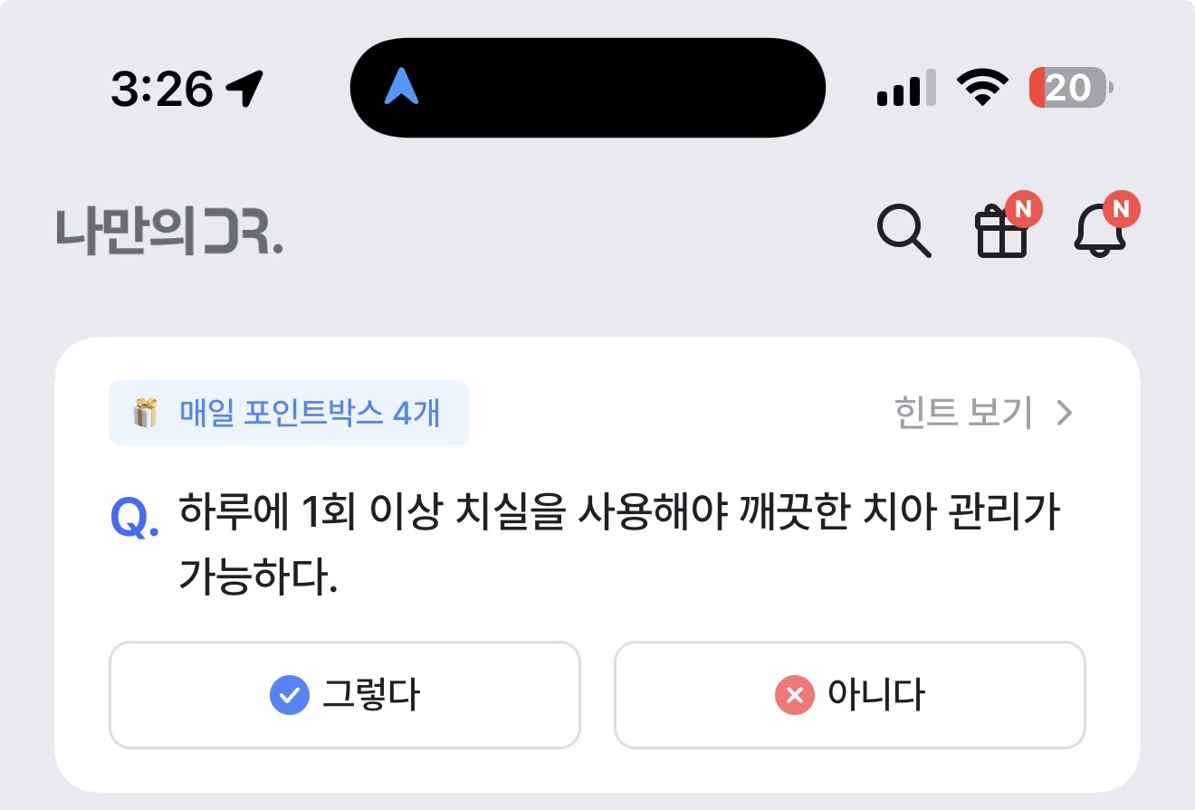 하루에 1회 이상 치실을 사용해야 깨끗한 치아 관리가 가능하다. 그렇다 아니다 선택하면 되는데요. 치아관리는 정말 중요하죠. 약간만 소홀히 하면 엄청난 대가와 비용을 들여야 하는데요. 잘 참고해 두세요