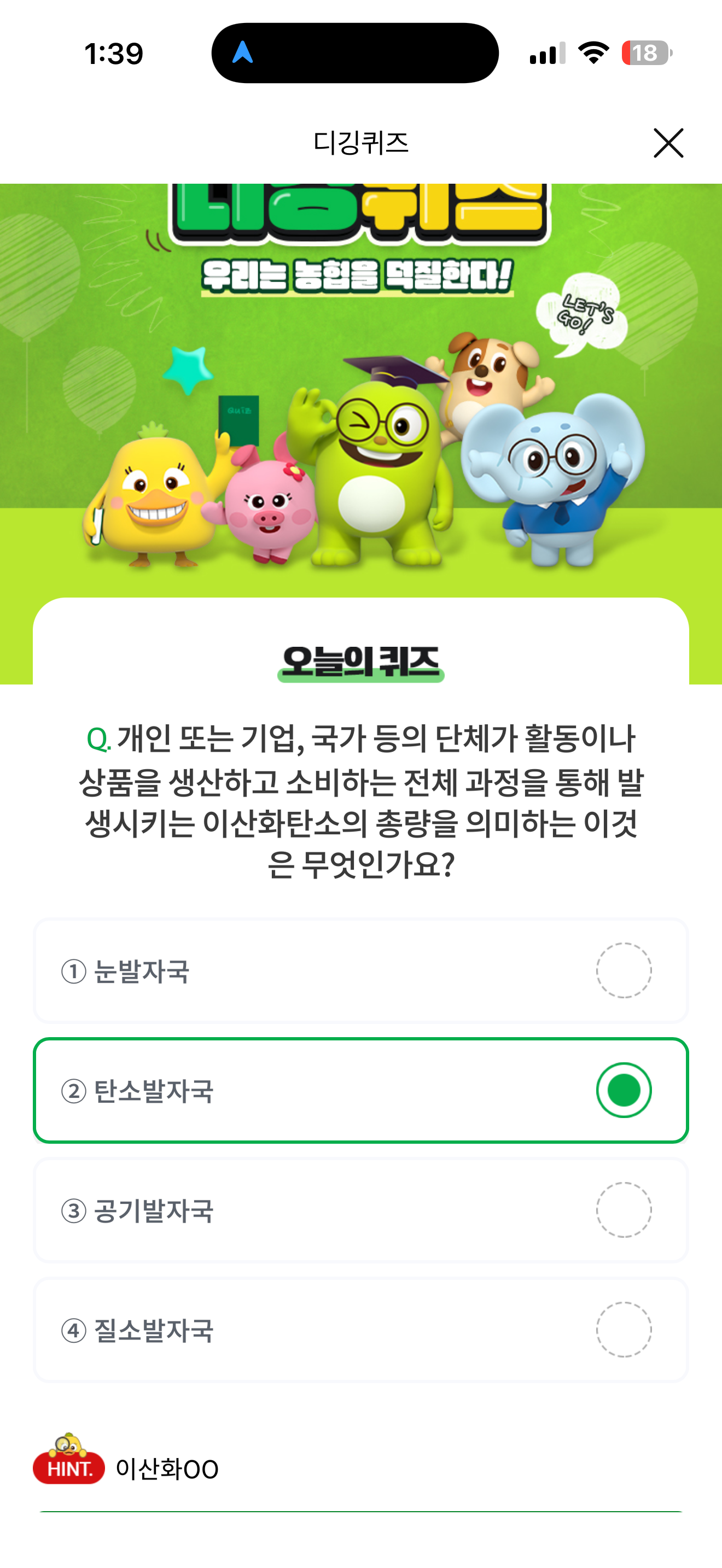 NH올원뱅크 디깅퀴즈 정답은 탄소발자국 입니다