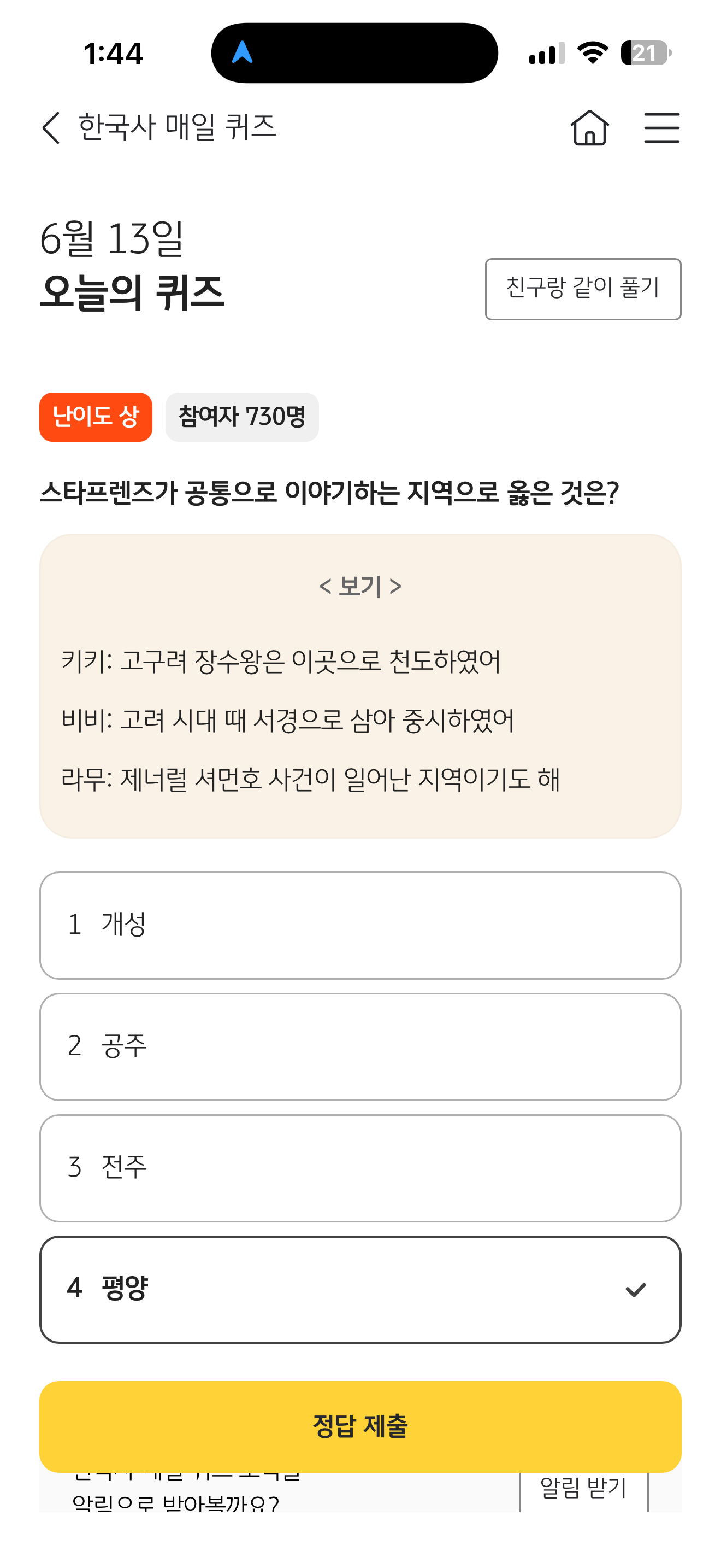 KB스타뱅킹 한국사 매일 퀴즈 정답은 평양 입니다