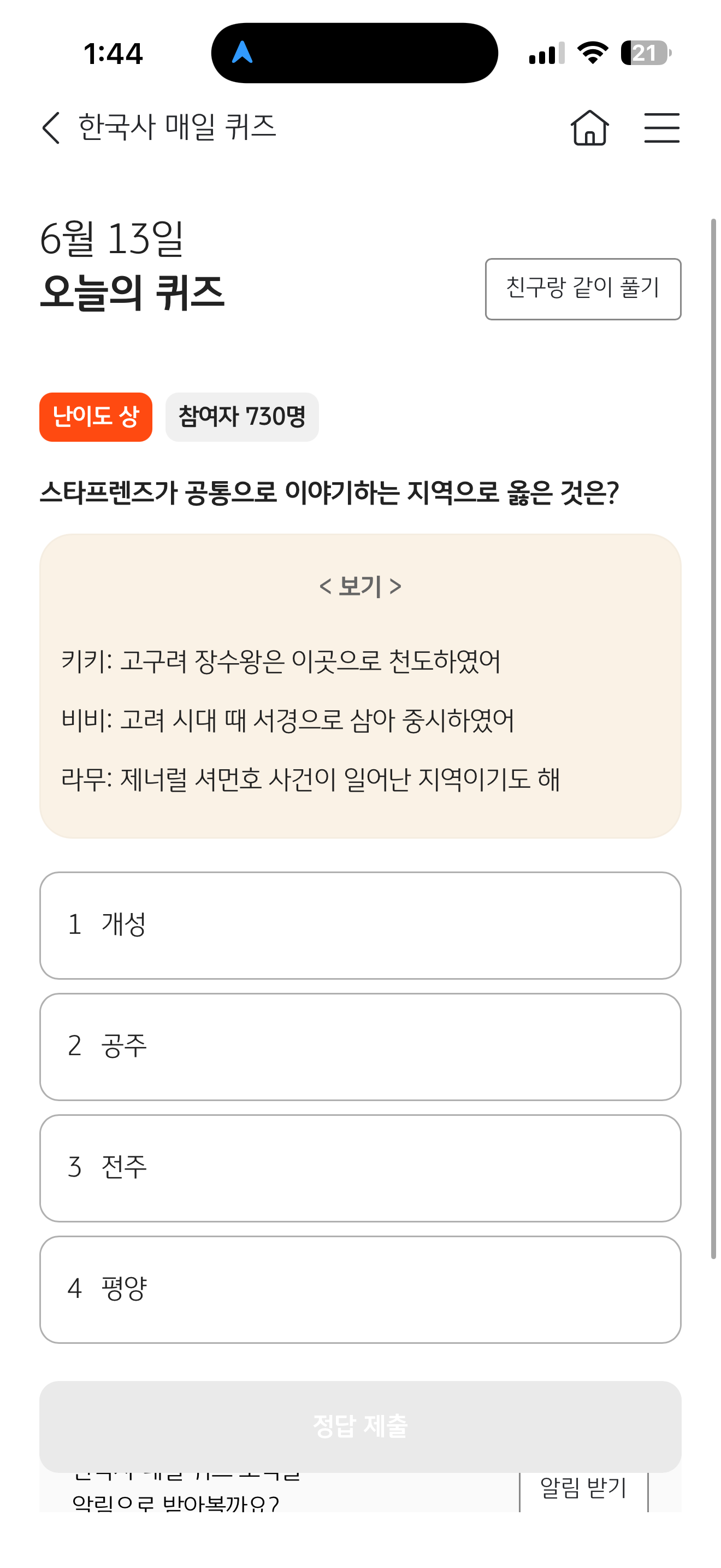 KB스타뱅킹 한국사 매일 퀴즈 6월 13일 문제입니다