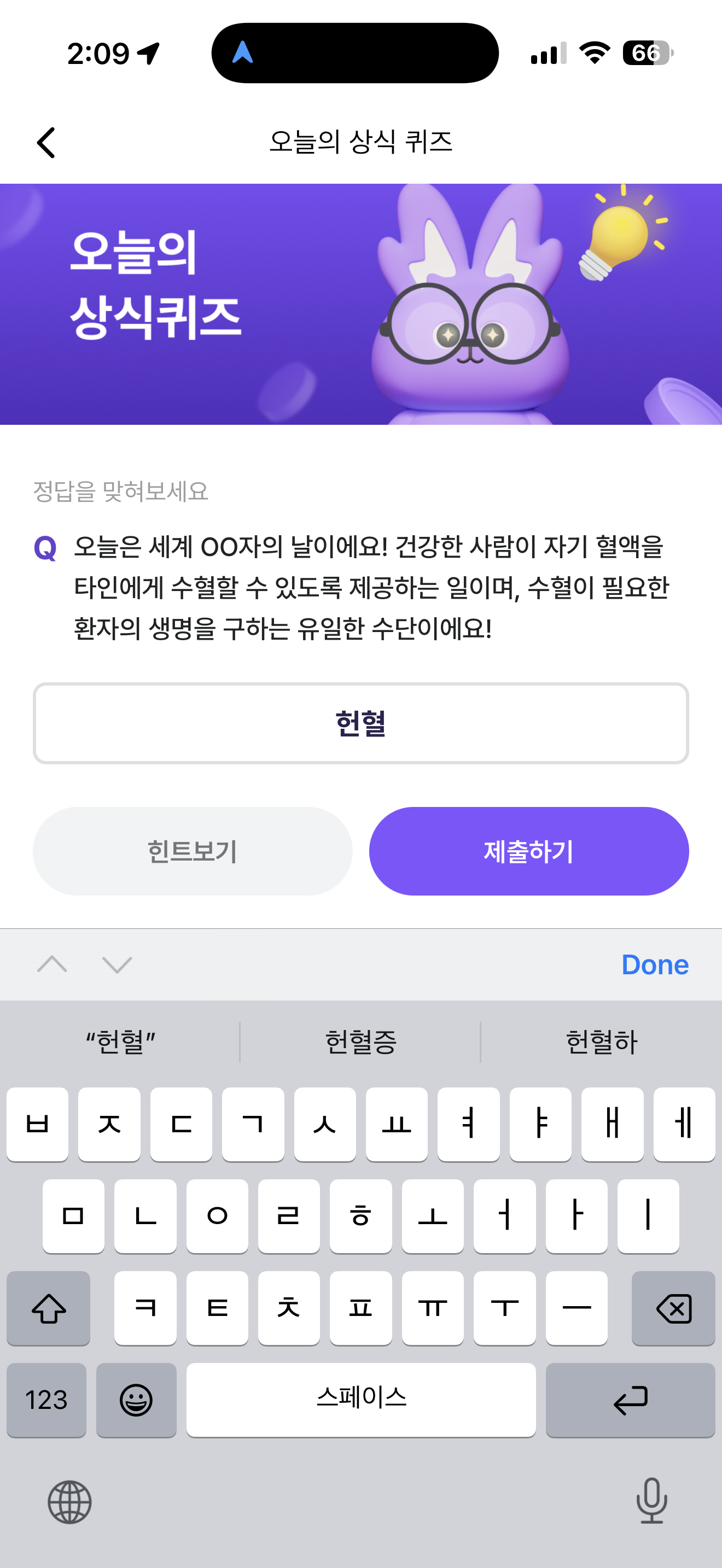 오늘은 세계 OO자의 날이에요! 건강한 사람이 자기 혈액을 타인에게 수혈할 수 있도록 제공하는 일이며, 수혈이 필요한 환자의 생명을 구하는 유일한 수단이에요! 주관식 퀴즈인데요. 혈액을 나눔으로서 정말 필요한 사람에게 큰 힘이 될 수 있습니다.