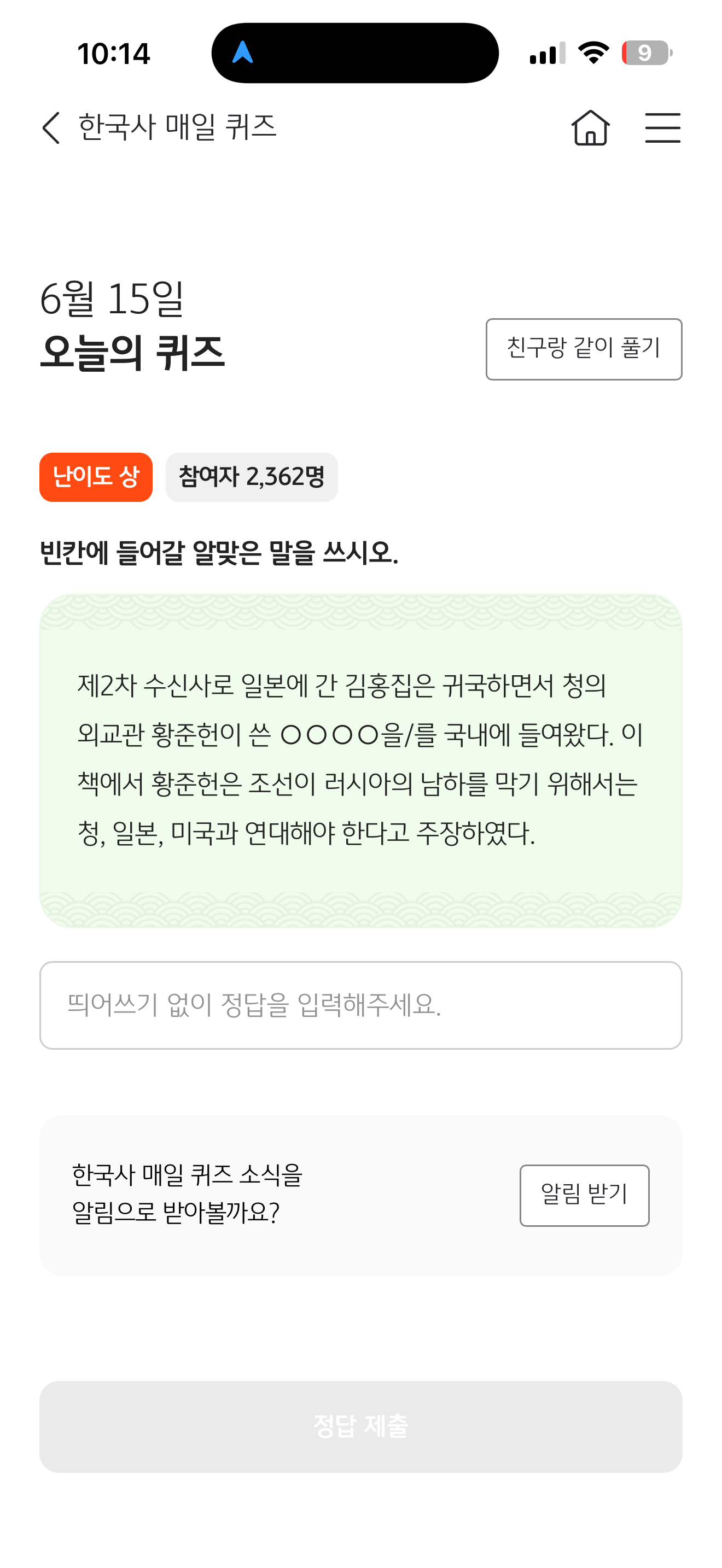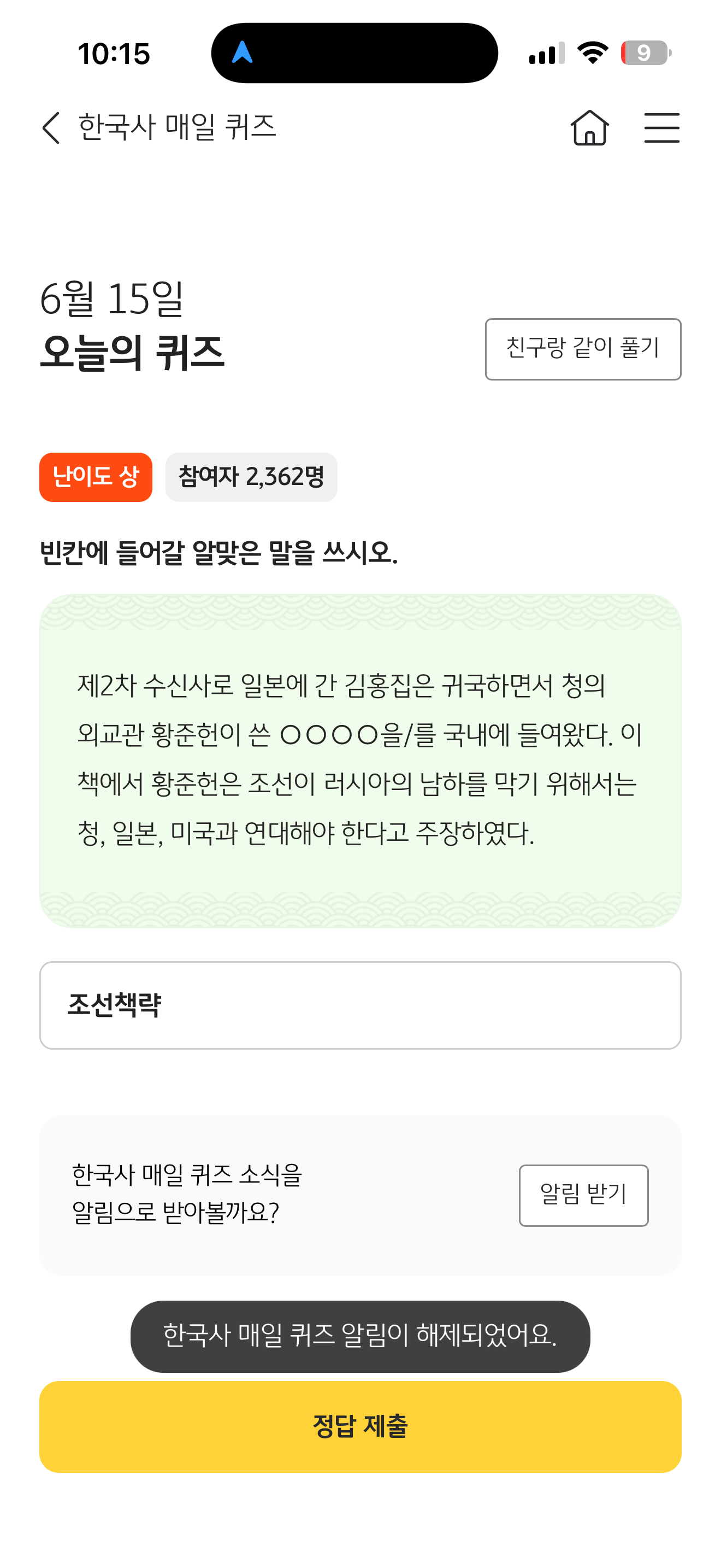 KB스타뱅킹 한국사 매일 퀴즈 정답은 조선책략 입니다