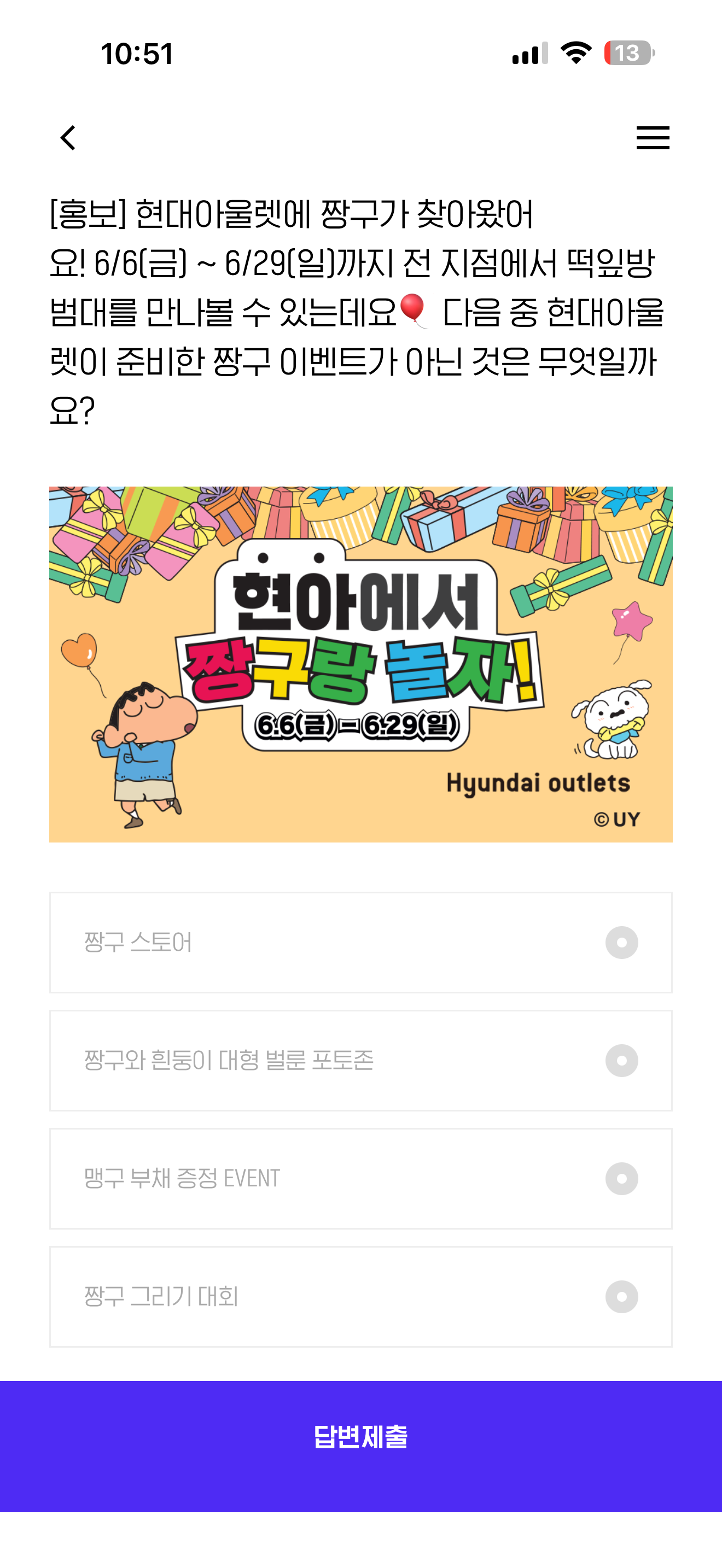 H포인트 퀴즈 6월 15일 정답(현대아울렛에 짱구가 찾아왔어요! 6/6(금) ~ 6/29(일)까지 전 지점에서 떡잎방범대를 만나볼 수 있는데요 다음 중 현대아울렛이 준비한 짱구 이벤트가 아닌 것은 무엇일까요?)