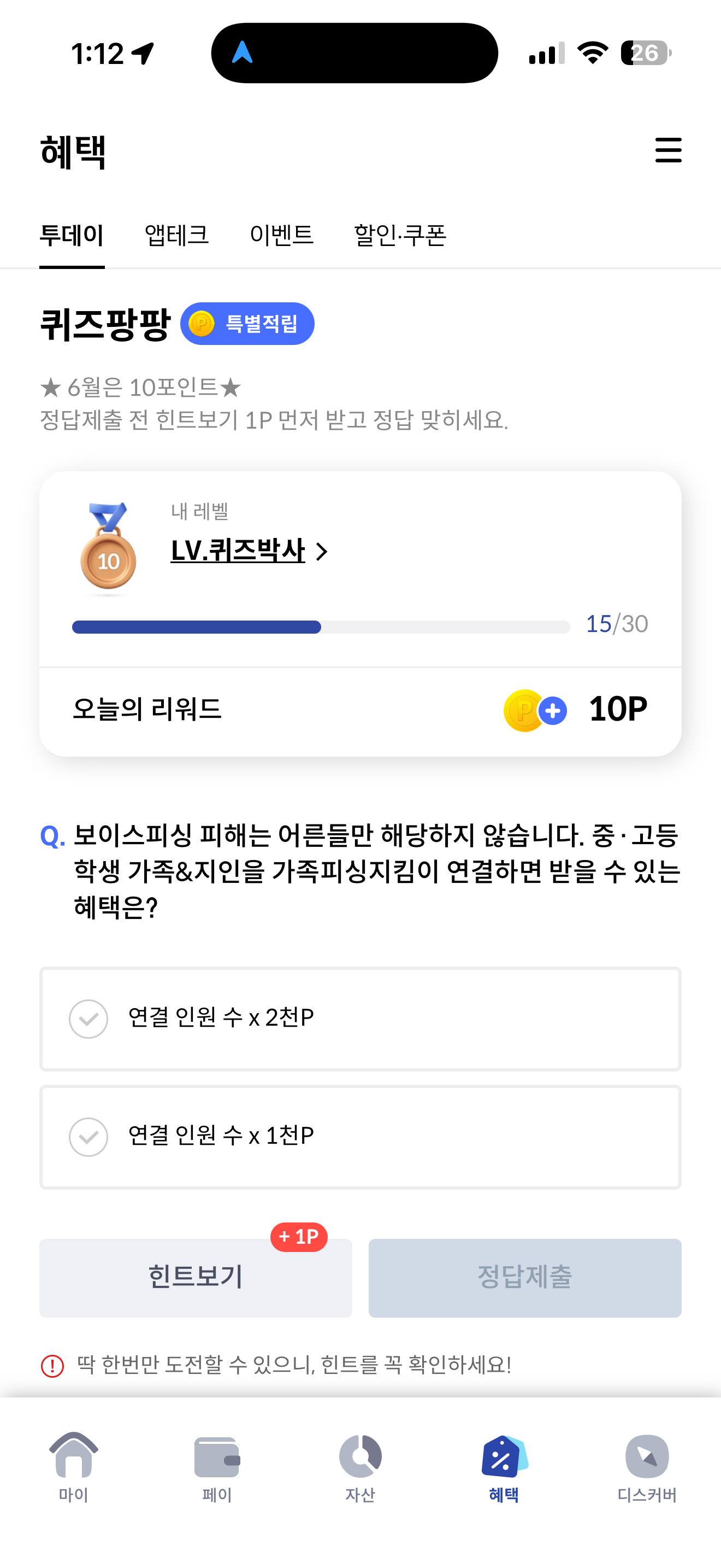 보이스피싱 피해는 어른들만 해당하지 않습니다. 중 고등 학생 가족&지인을 가족피싱지킴이 연결하면 받을 수 있는 혜택은? 보기는 1. 연결 인원 수 x 2천P 2. 연결 인원 수 x 1천P 입니다.