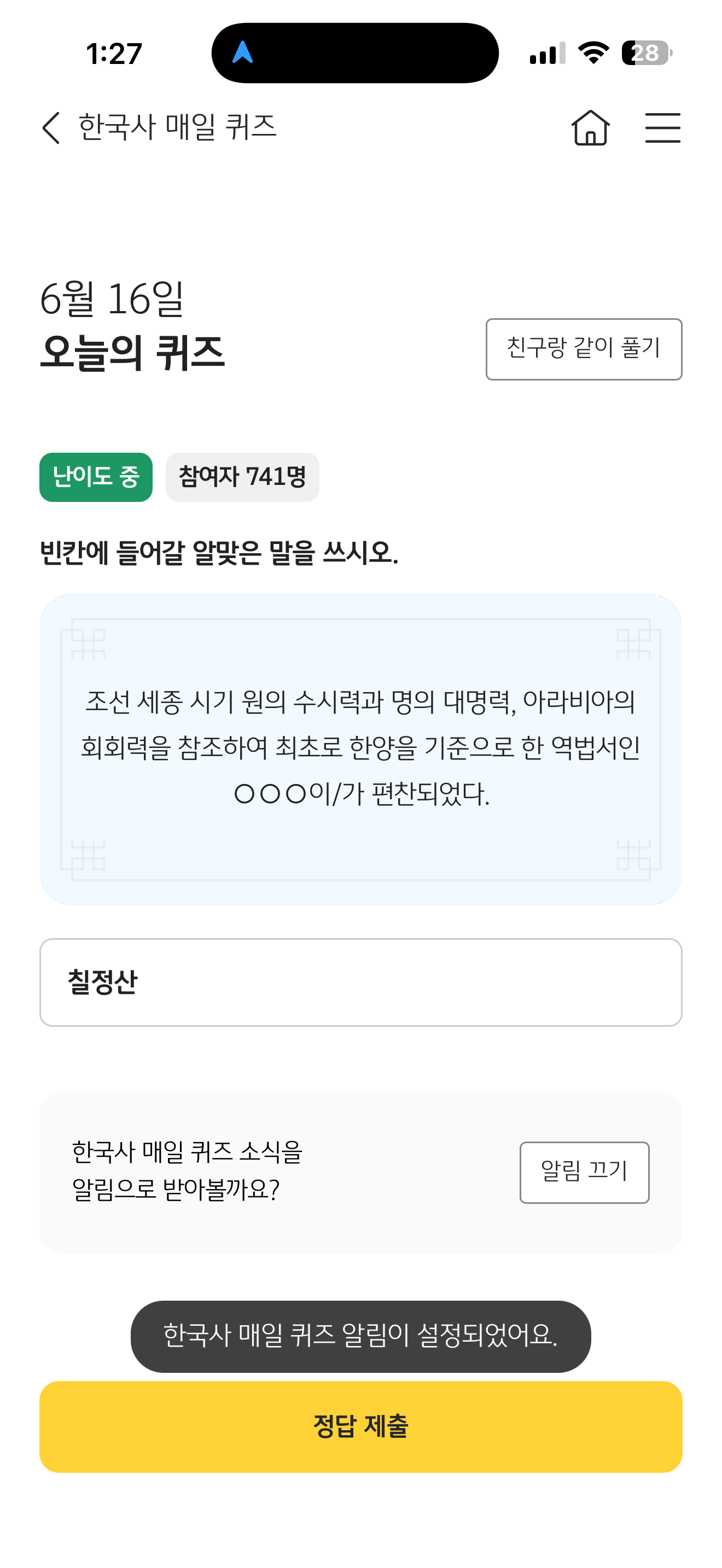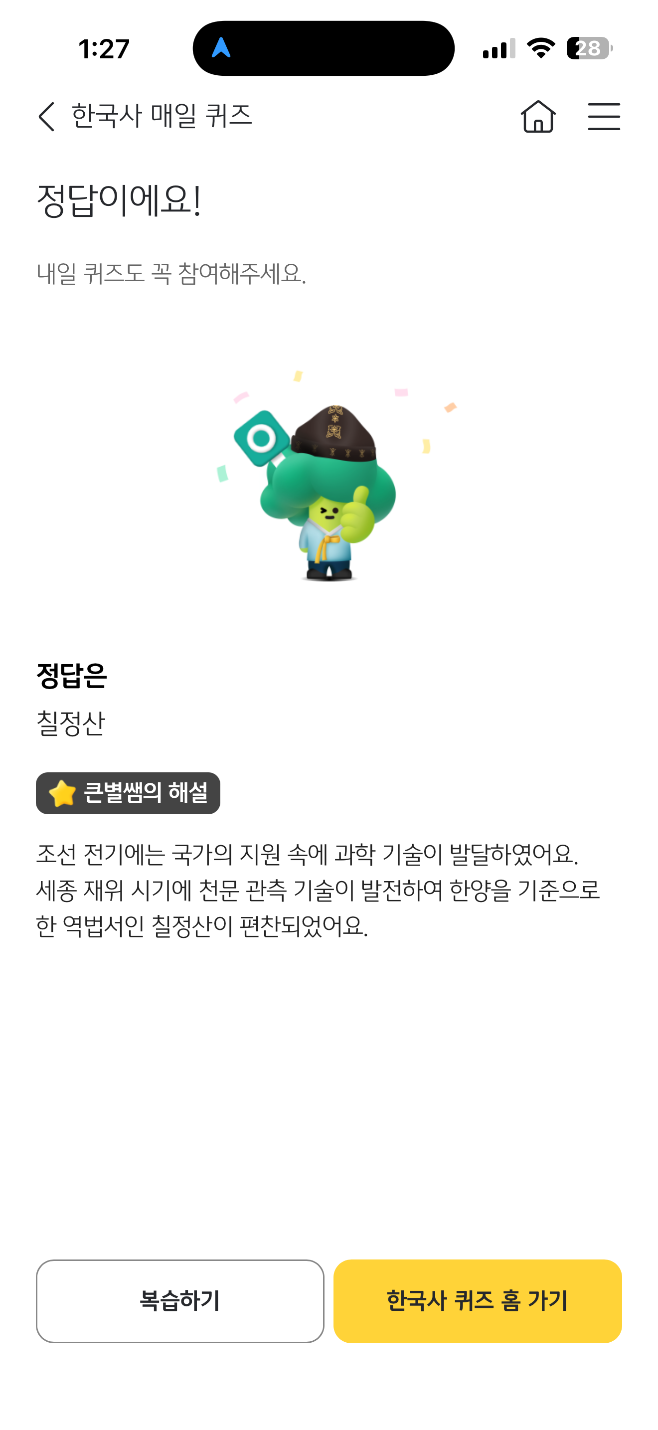 KB스타뱅킹 한국사 매일 퀴즈 정답은 칠정산 입니다