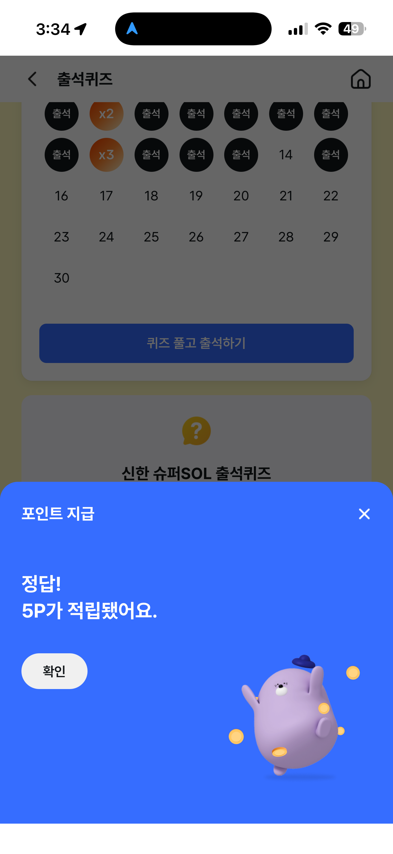 신한 슈퍼SOL 출석퀴즈 정답은 X 입니다