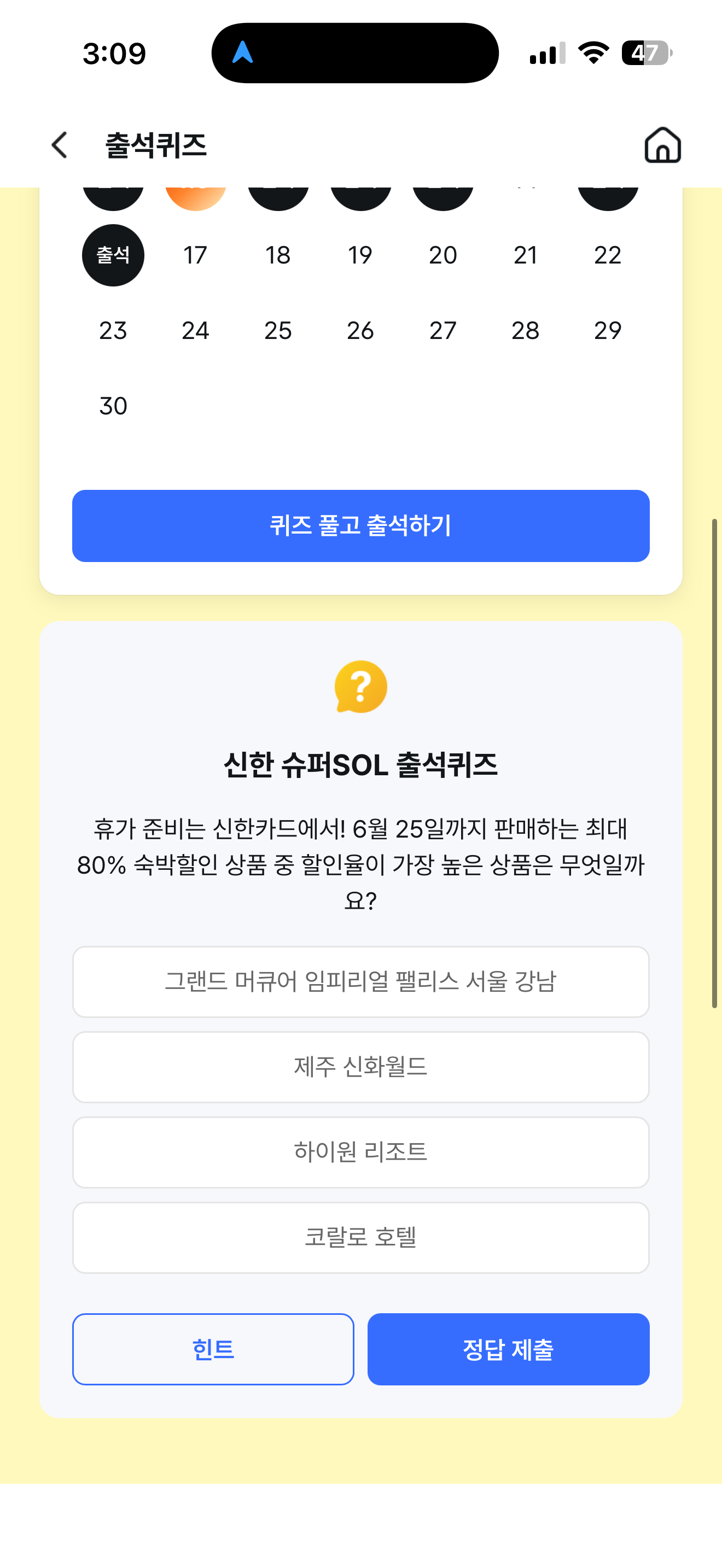 신한 슈퍼SOL 출석퀴즈 6월 17일 문제입니다