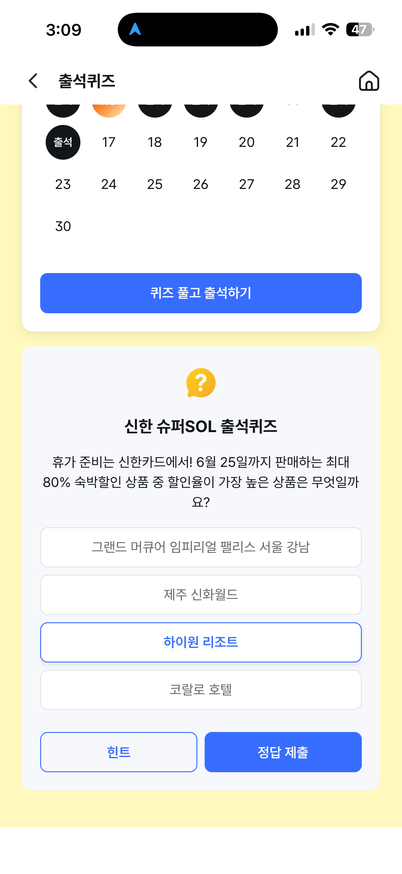 신한 슈퍼SOL 출석퀴즈 정답은 하이원 리조트 입니다