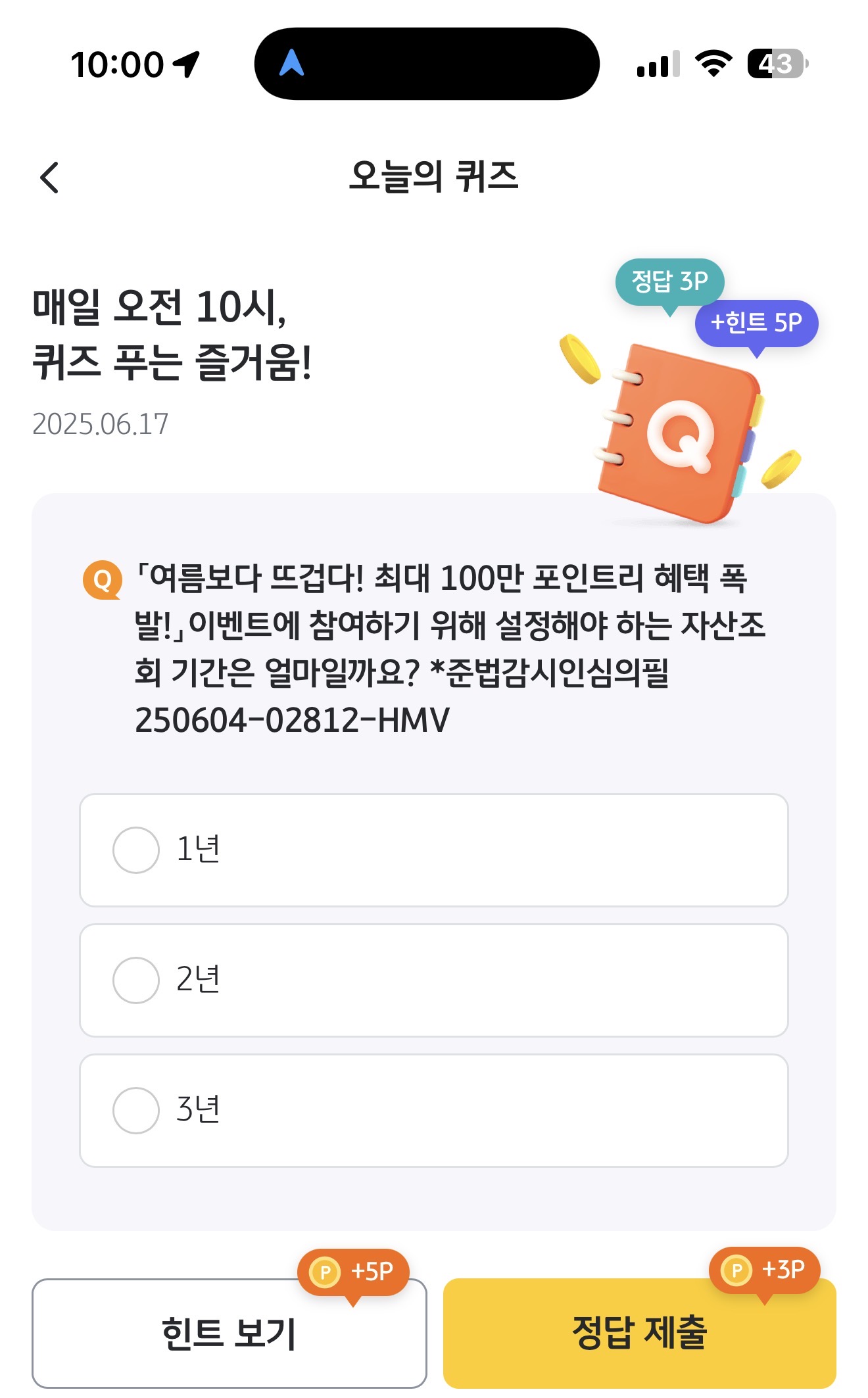 여름보다 뜨겁다! 최대 100만 포인트리 혜택 폭발! 이벤트에 참여하기 위해 설정해야 하는 자산조회 기간은 얼마일까요? *준법감시인심의필250604-02812-HMV 보기는 1. 1년 2. 2년 3. 3년 입니다.