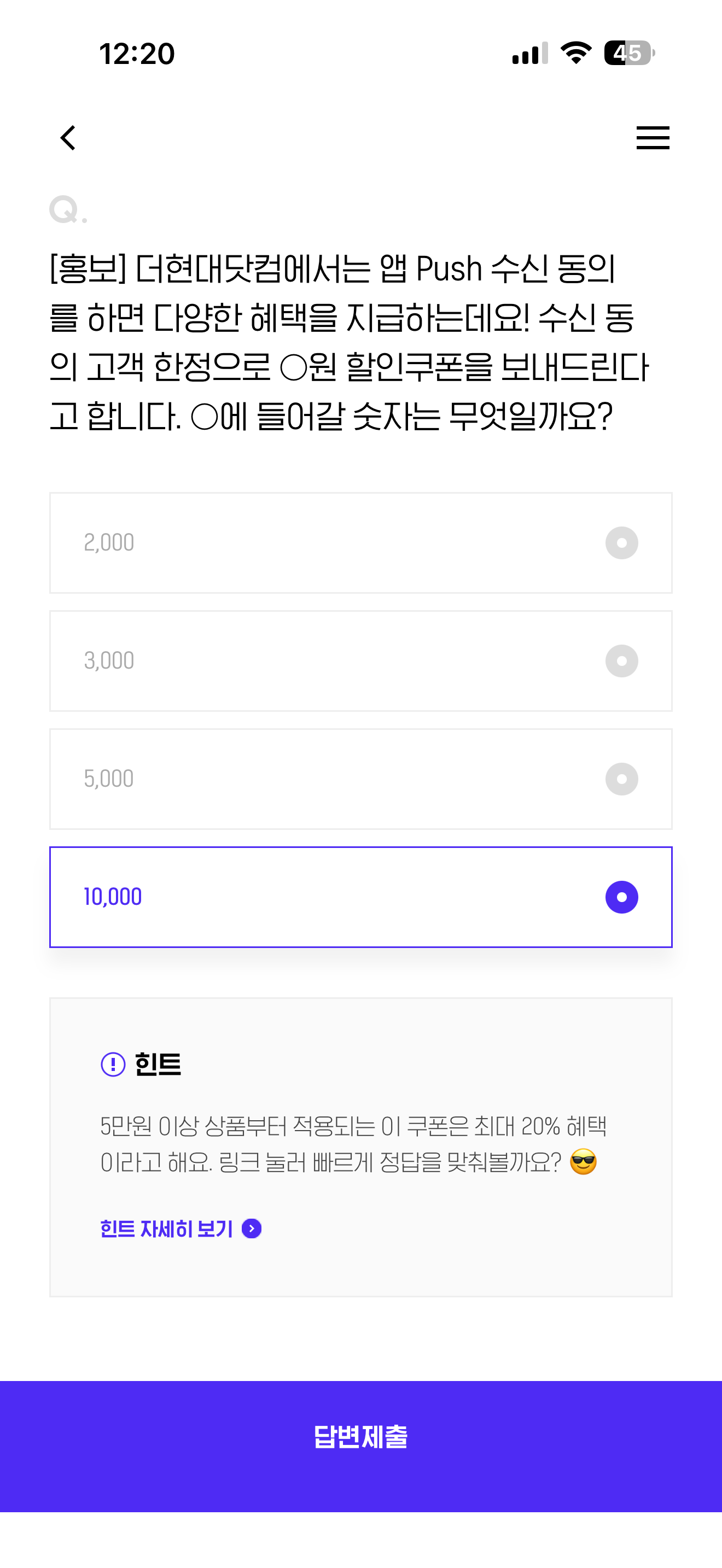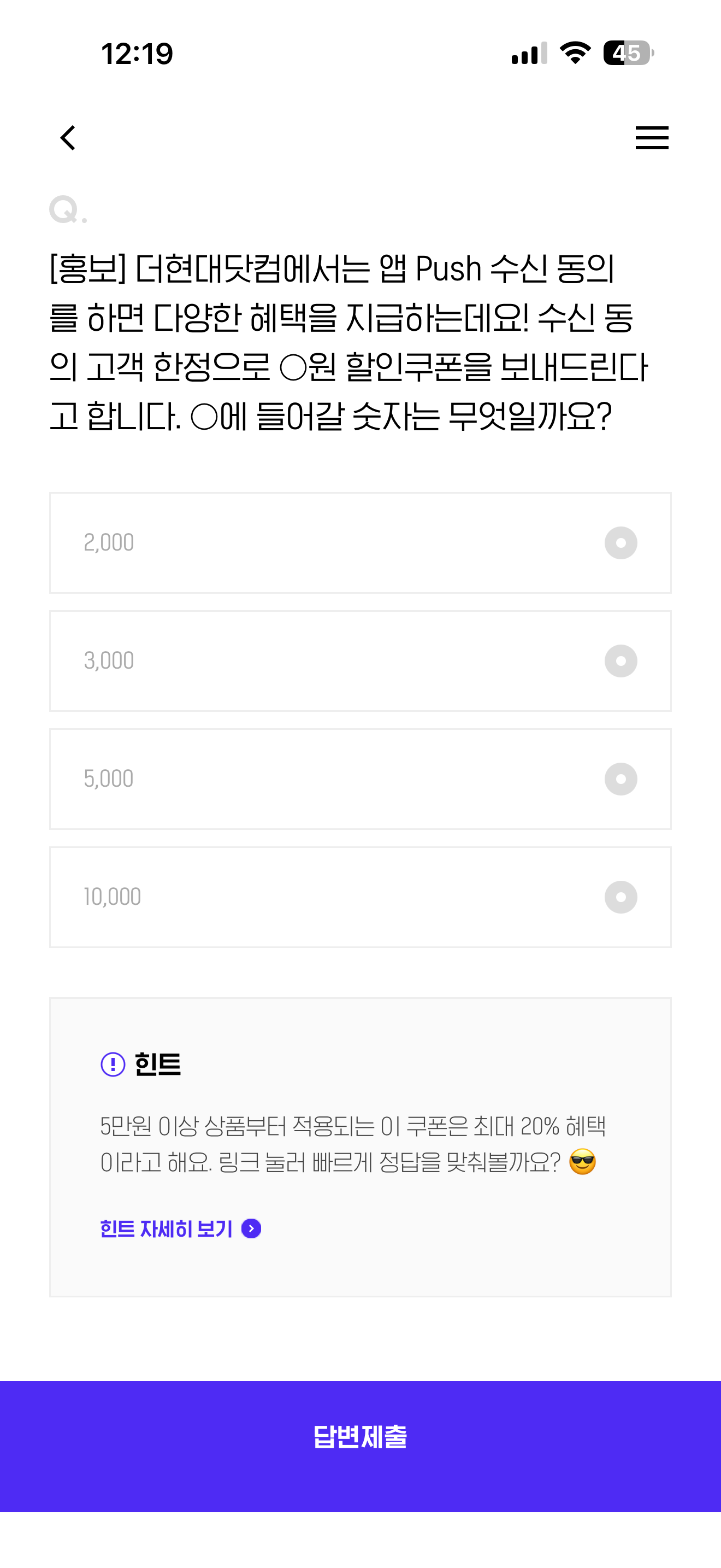 더현대닷컴에서는 앱 Push 수신 동의를 하면 다양한 혜택을 지급하는데요! 수신 동의 고객 한정으로 O원 할인쿠폰을 보내드린다고 합니다. O에 들어갈 숫자는 무엇일까요? 보기는 1. 2,000 2. 3,000 3. 5,000 4. 10,000 입니다.