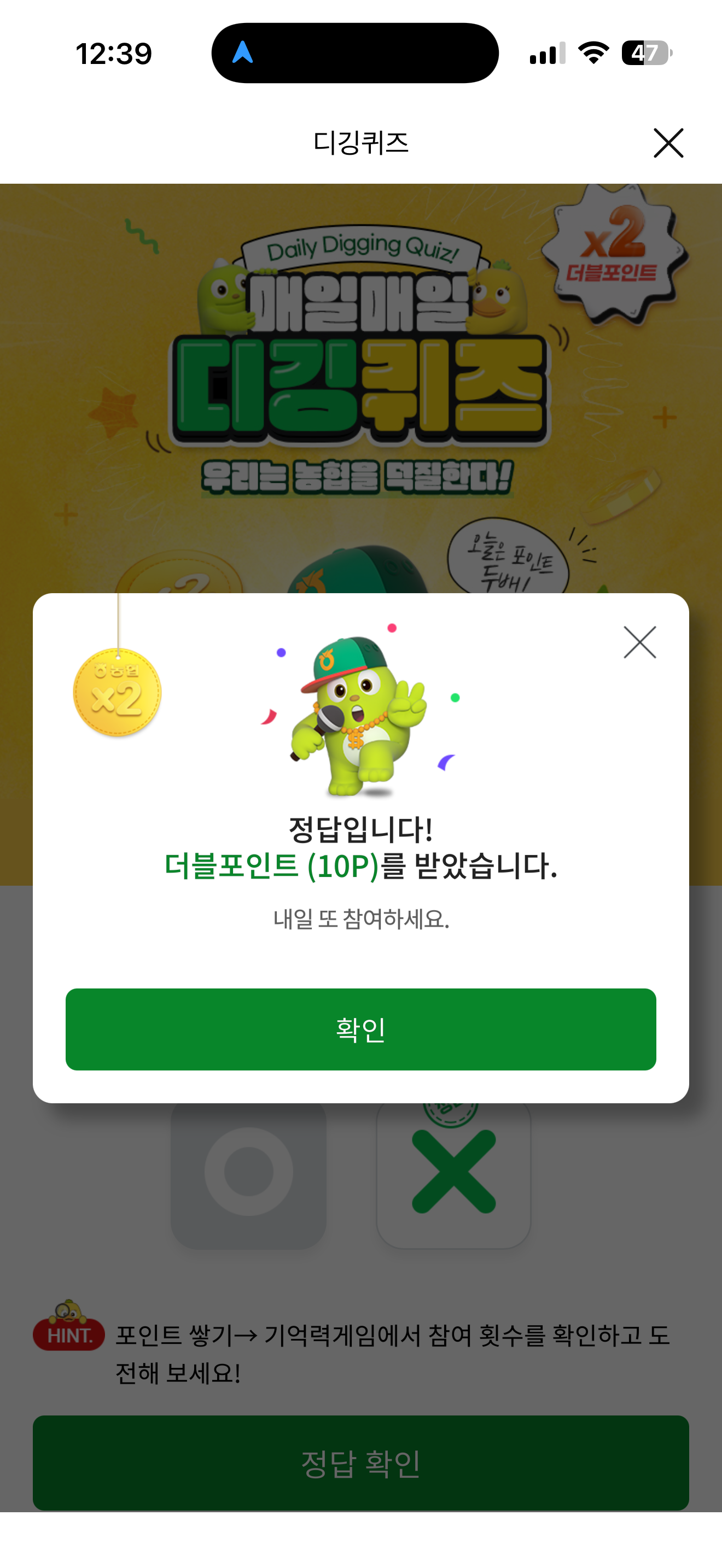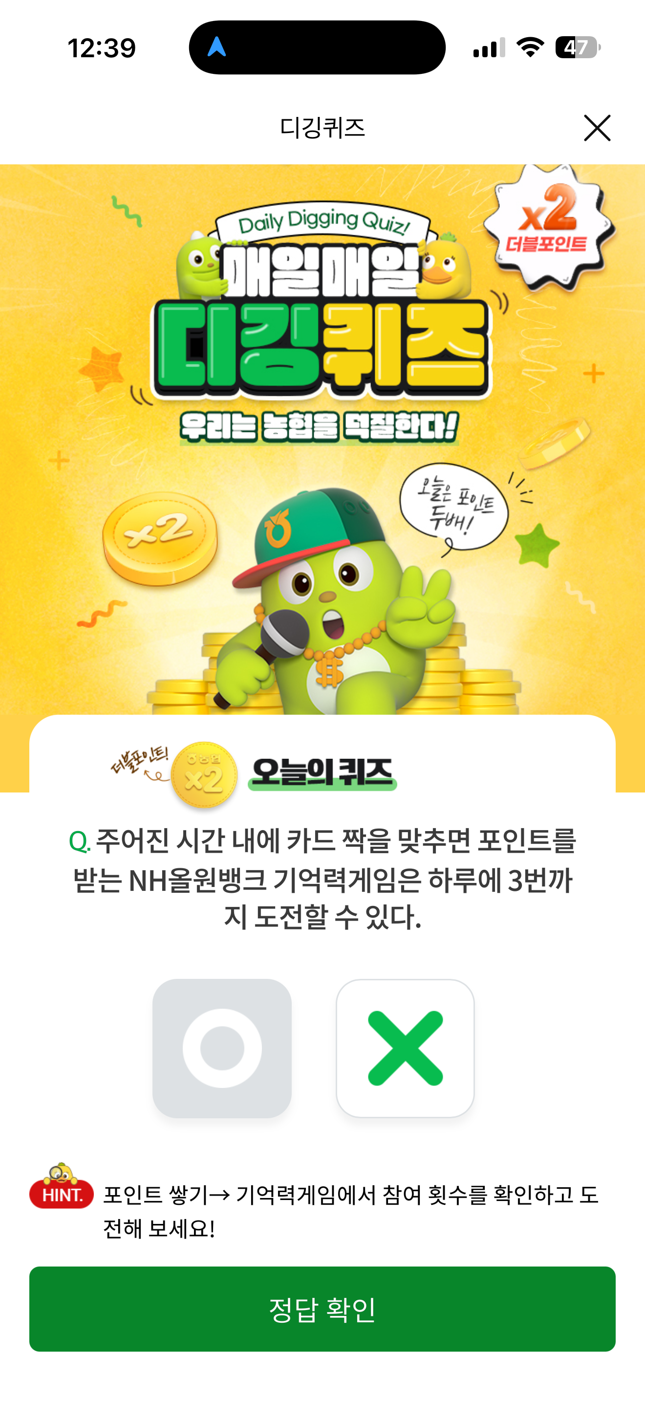 NH올원뱅크 디깅퀴즈 정답은 X 입니다