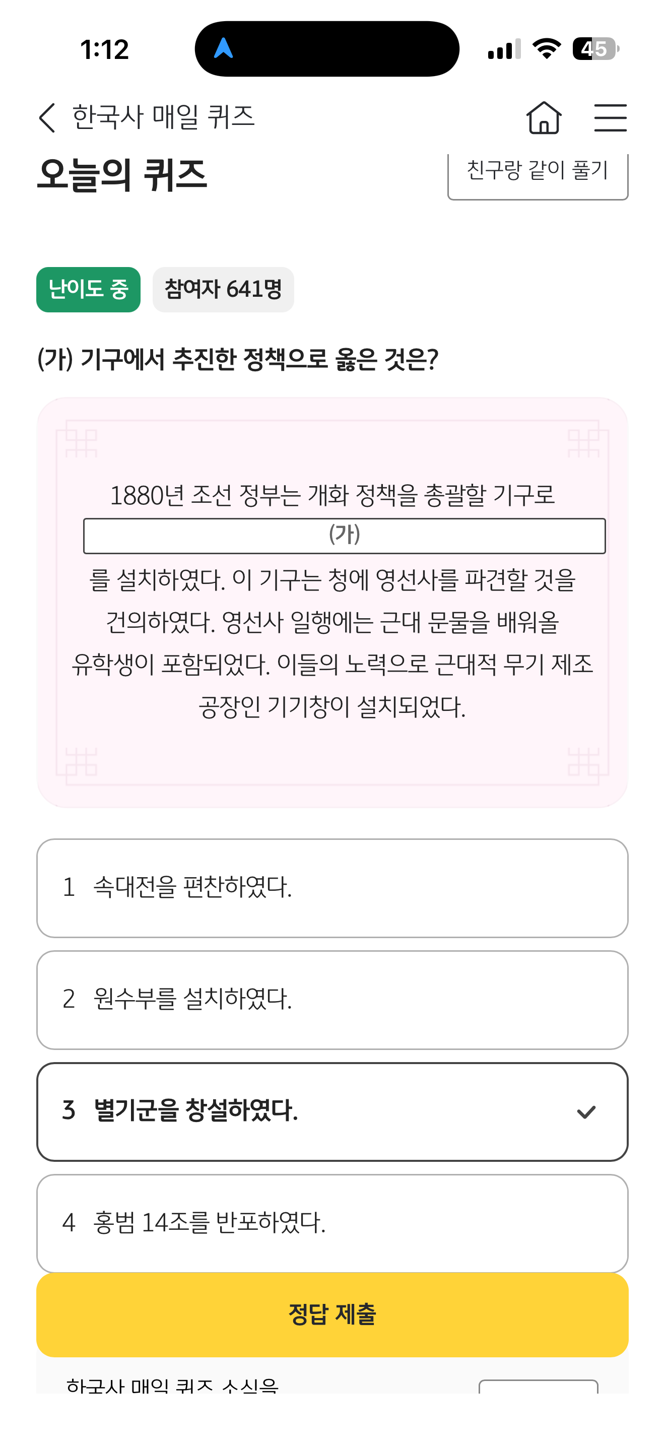 KB스타뱅킹 한국사 매일 퀴즈 정답은 별기군을 창설하였다 입니다