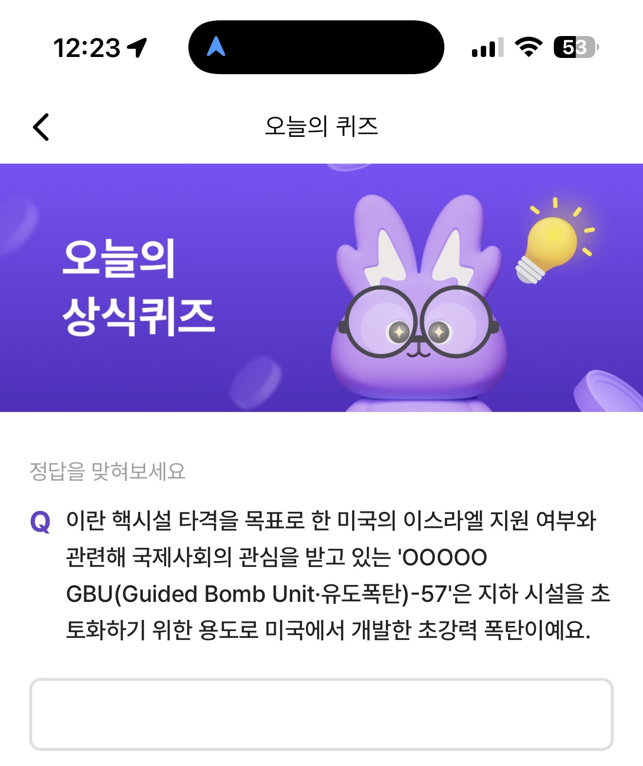 이란 핵시설 타격을 목표로 한 미국의 이스라엘 지원 여부와 관련해 국제사회의 관심을 받고 있는 'OOOOO GBU(Guided Bomb Unit 유도폭탄)-57'은 지하 시설을 초토화하기 위한 용도로 미국에서 개발한 초강력 폭탄이예요. 주관식 퀴즈인데요