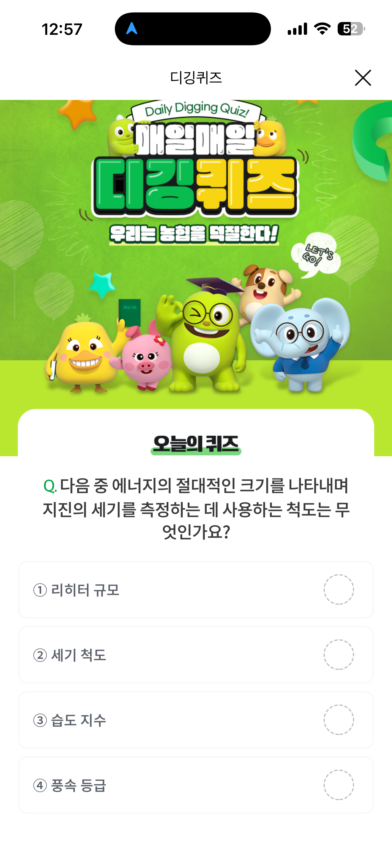 NH올원뱅크 디깅퀴즈 정답은 리히터 규모 입니다