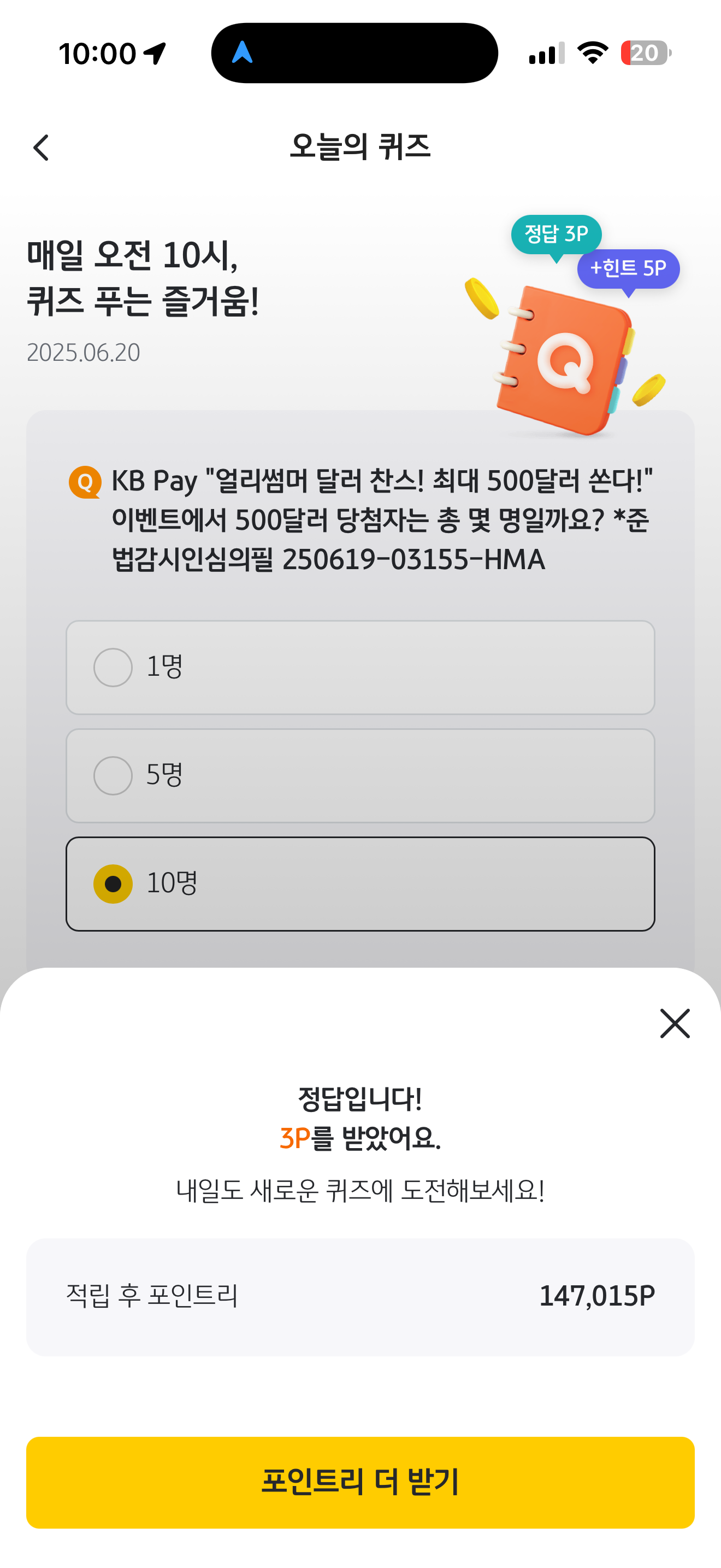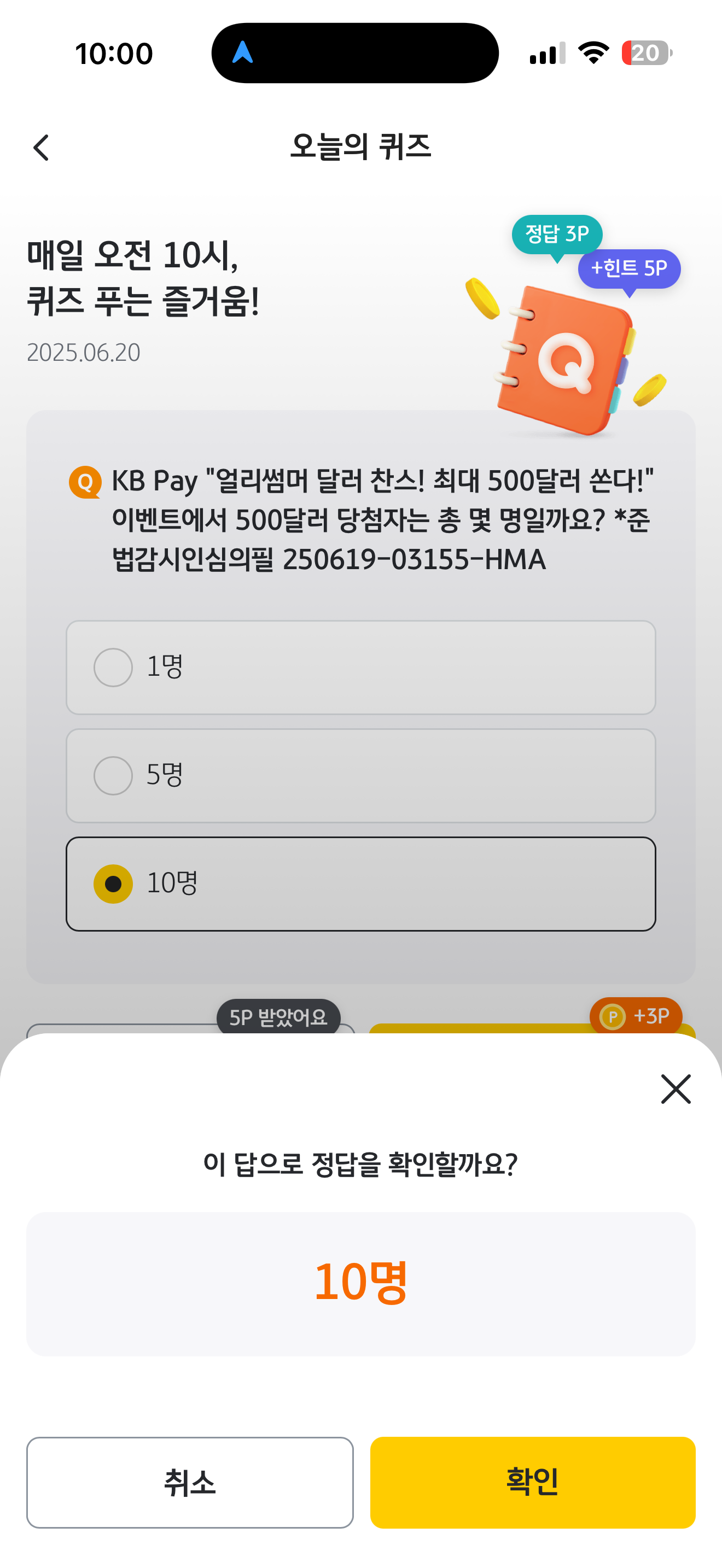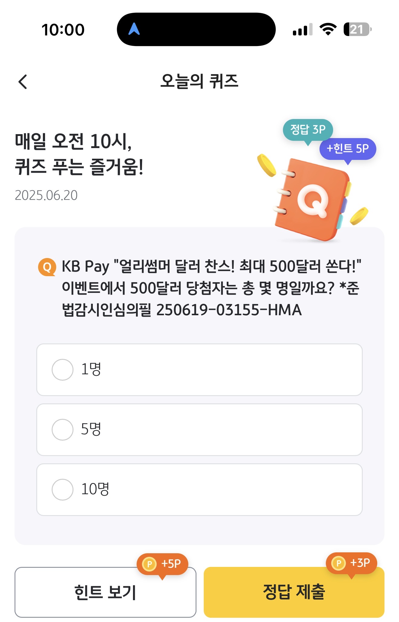 KB pay 오늘의 퀴즈 정답은 10명 입니다