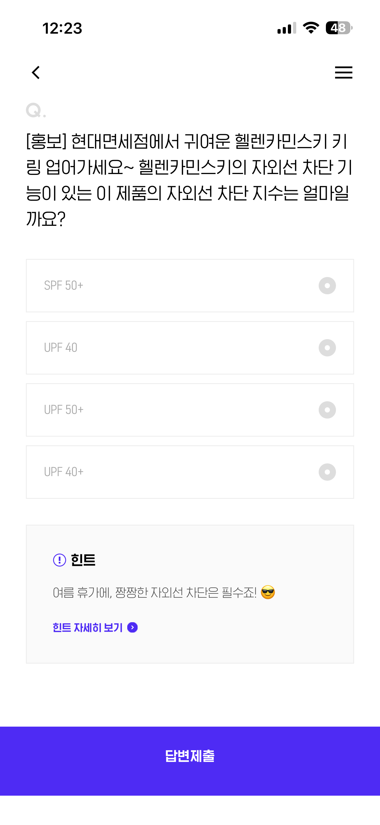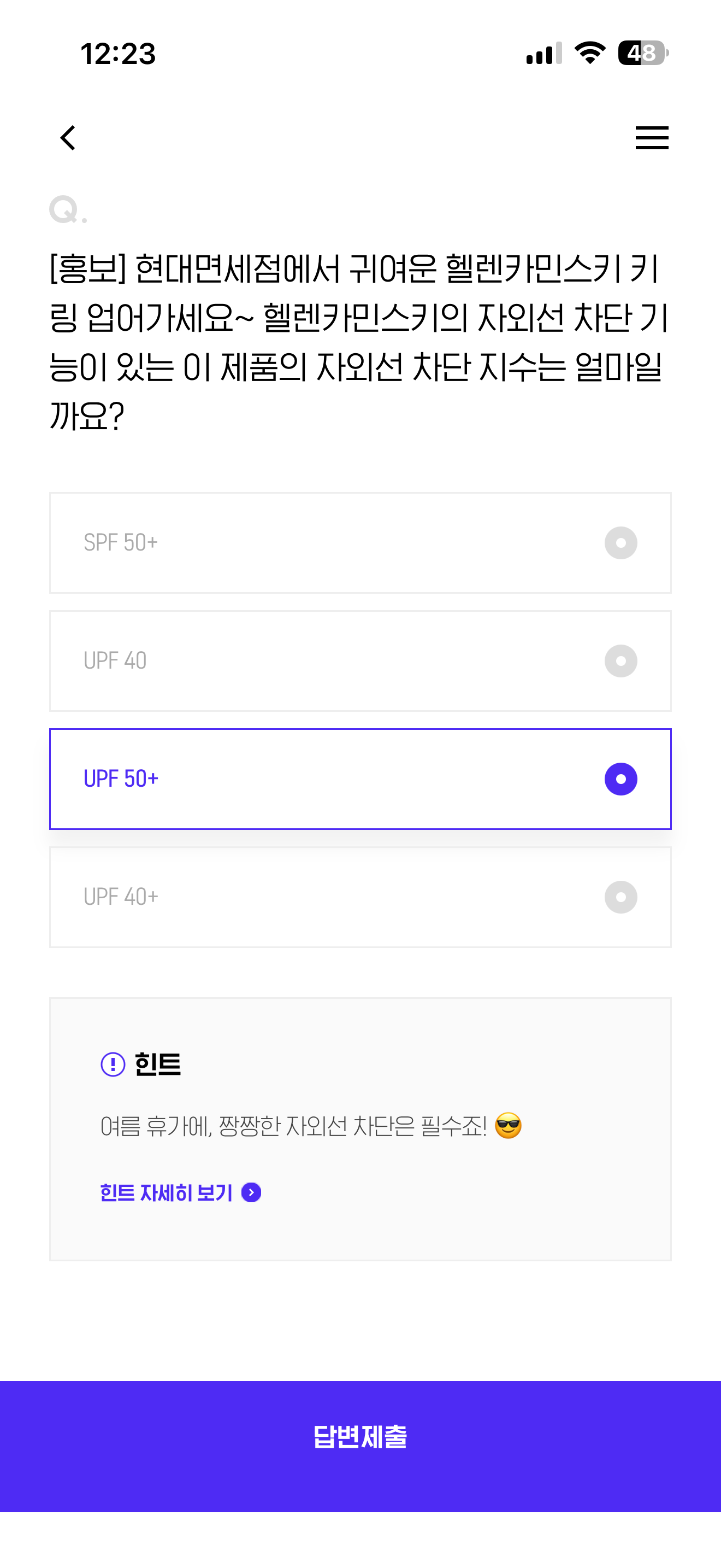 H포인트 퀴즈 정답은 UPF 50+ 입니다