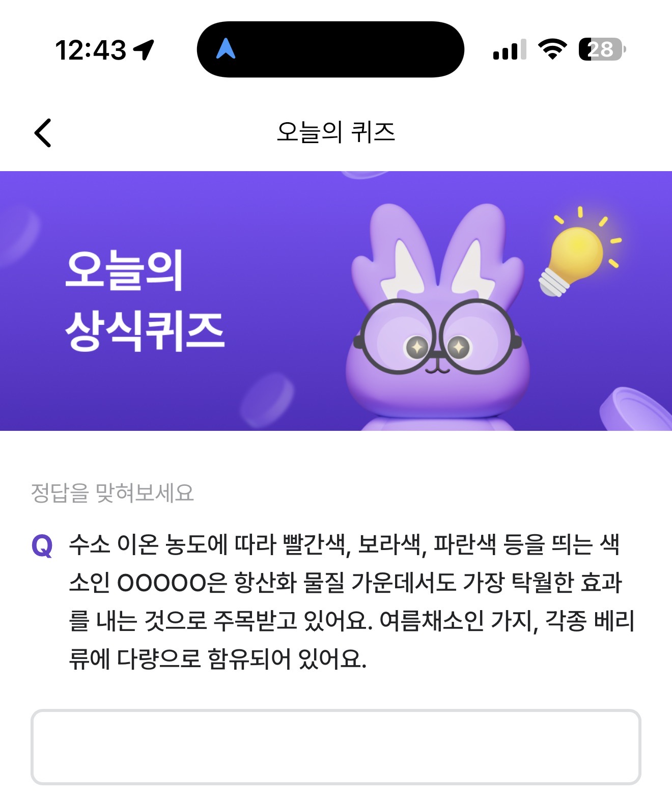 비트버니 오늘의 퀴즈 6월 22일 ㅇㅌㅅㅇㄴ 정답(수소 이온 농도에 따라 빨간색, 보라색, 파란색 등을 띄는 색소인 OOOOO은 항산화 물질 가운데서도 가장 탁월한 효과를 내는 것으로 주목받고 있어요. 여름채소인 가지, 각종 베리류에 다량으로 함유되어 있어요)